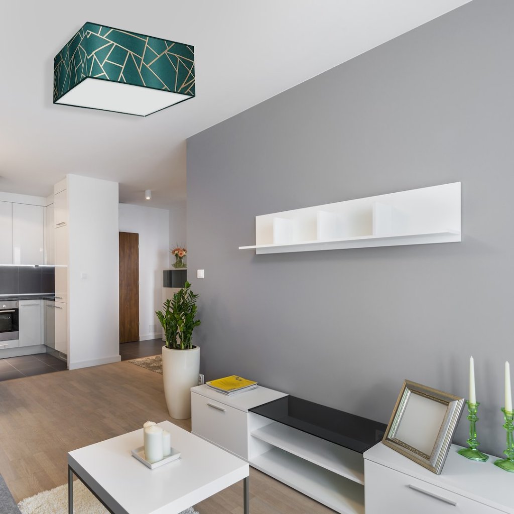 Originální stropní svítidlo ze série ZIGGY ve čtvercovém provedení o rozměru 40 cm zaujme kombinací zeleného textilního stínítka se zlatými akcenty a bílým plexisklem. Geometrický vzor dodává svítidlu moderní charakter, který perfektně doplní elegantní a odvážněji laděné interiéry.