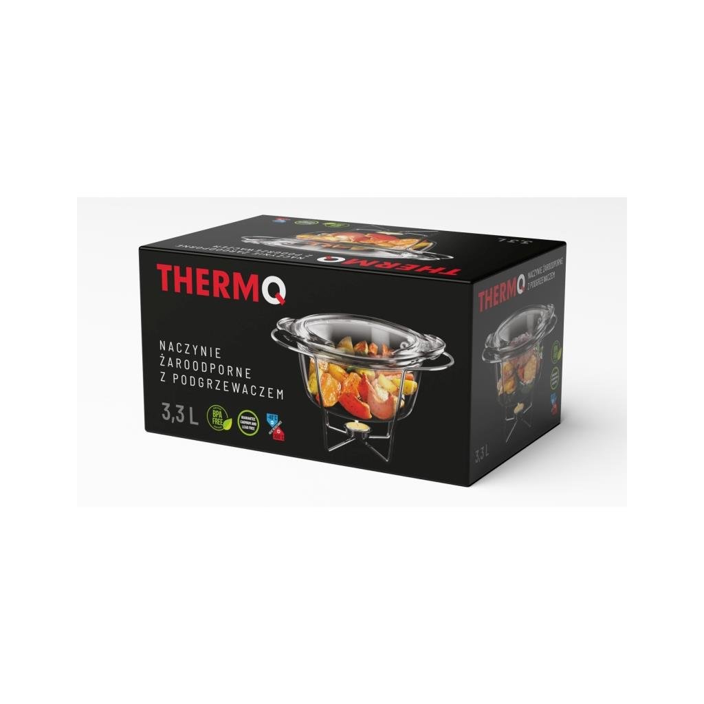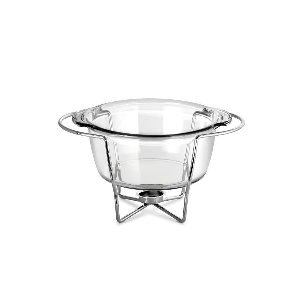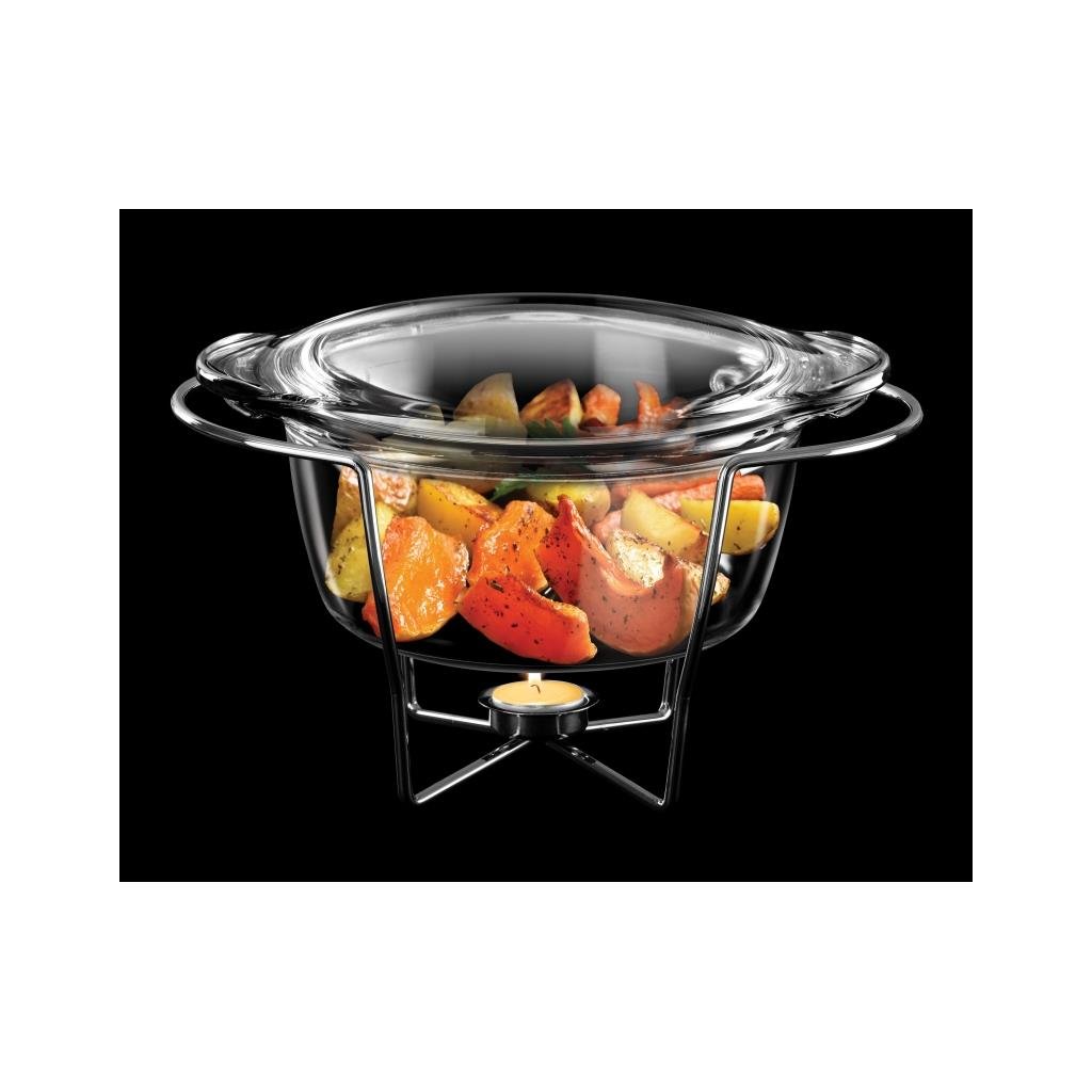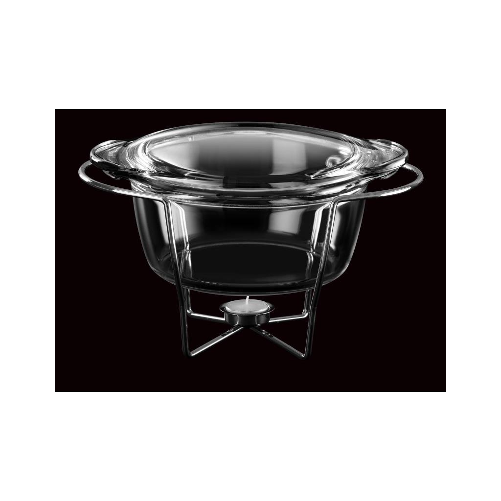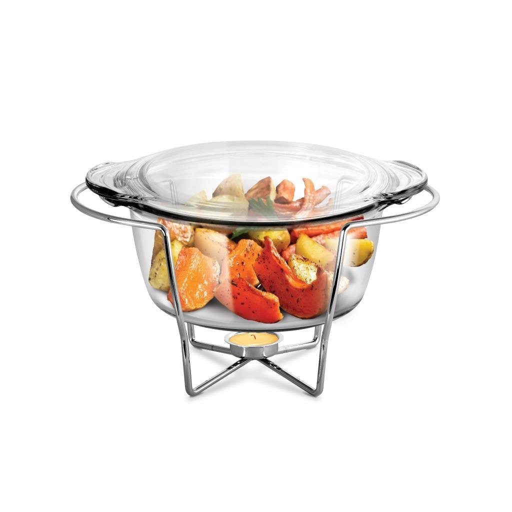 Kulatá žáruvzdorná skleněná nádoba o celkovém objemu 3,3 l je určena především na pečení, dušení a zapékání. Miska je dodávána s kovovým stojánkem s prostorem pro čajovou svíčku, který je ideální pro servírování připravených pokrmů přímo na stůl a díky plameni svíčky udržuje teplotu pokrmu.Kulatá žáruvzdorná skleněná mísa na podstavci, mísa s ohřívačem