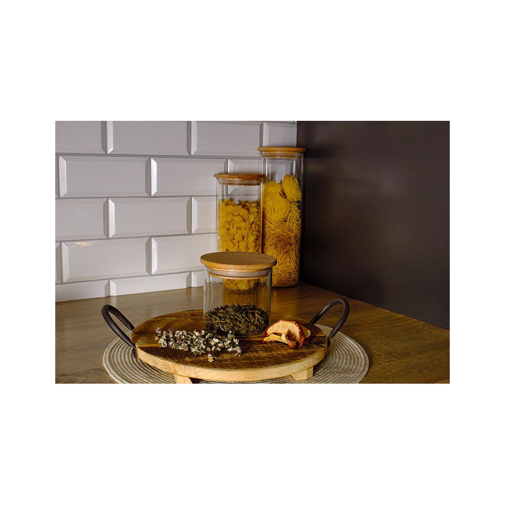 Skleněná miska na potraviny s dřevěným víkem byla vyrobena z borosilikátového skla nejvyšší kvality, které je vhodné pro styk s potravinami. Skleněná nádoba je ideální pro skladování potravin - suchých a sypkých, jako je mouka, obiloviny, sůl, káva nebo těstoviny - a díky těsnění na víku se nic nevylije. Skleněná nádoba na potraviny s dřevěným víkemMateriál: žáruvzdorné borosilikátové sklo, dřevo