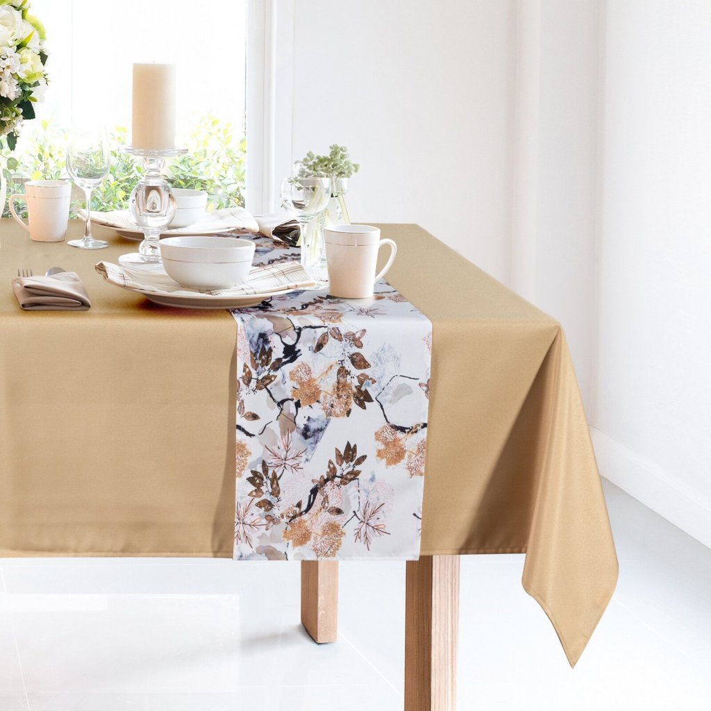 Sada ubrusů ANITA je elegantním a stylovým řešením pro každou jídelnu. Ubrus má tlumenou, jednotnou barvu, která vytváří pozadí pro jedinečně potištěný běhoun. Běhoun, který je ústředním dekorativním prvkem, je zdoben jemným vzorem. Materiál je vysoce kvalitní, což zaručuje odolnost a eleganci. Šířka (ubrus): 140 cm, délka (ubrus): 220 cm, šířka (běhoun): 33 cm, délka (běhoun): 220 cm, barva: béžová (ubrus), vícebarevná (běhoun), hmotnost: 155 GSM, složení: 100% polyester.Doplňkové parametry