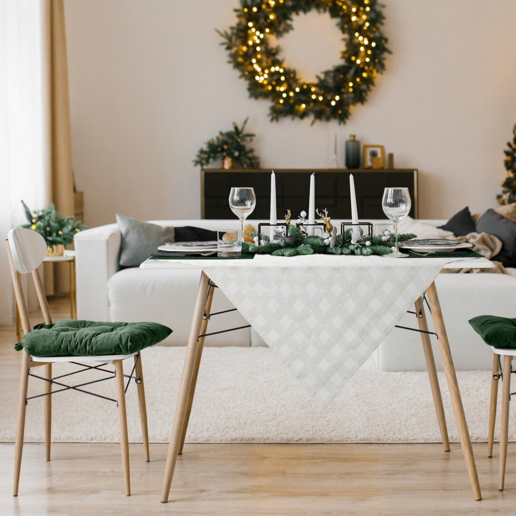 Lesklý ubrus s vánočním motivem, šířka: 85 cm, délka: 85 cm, barva: krémová, složení: 65 % polyester, 27 % bavlna, 8 % kovová nit.Doplňkové parametry