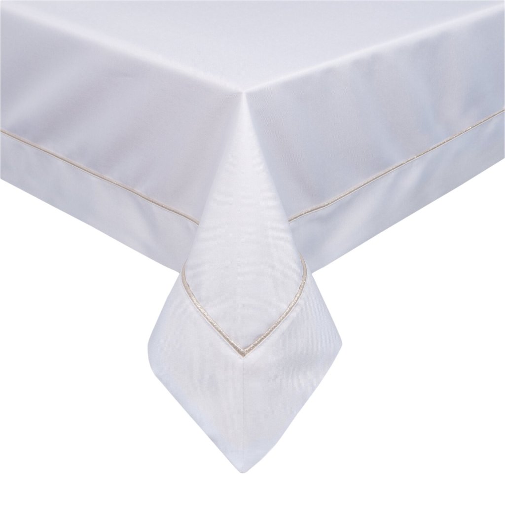ubrus s jemným stříbrným lemováním, baleno v elegantní krabici šířka: 145 cm, délka: 280 cm, barva: bílá zlatá, hmotnost: 190 GSM, složení: 100% polyester.Doplňkové parametry