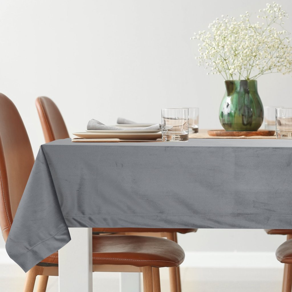Sametový ubrus, šířka: 180 cm, délka: 140 cm, barva: šedá, hmotnost: 210 GSM, složení: 100% polyester.Doplňkové parametry