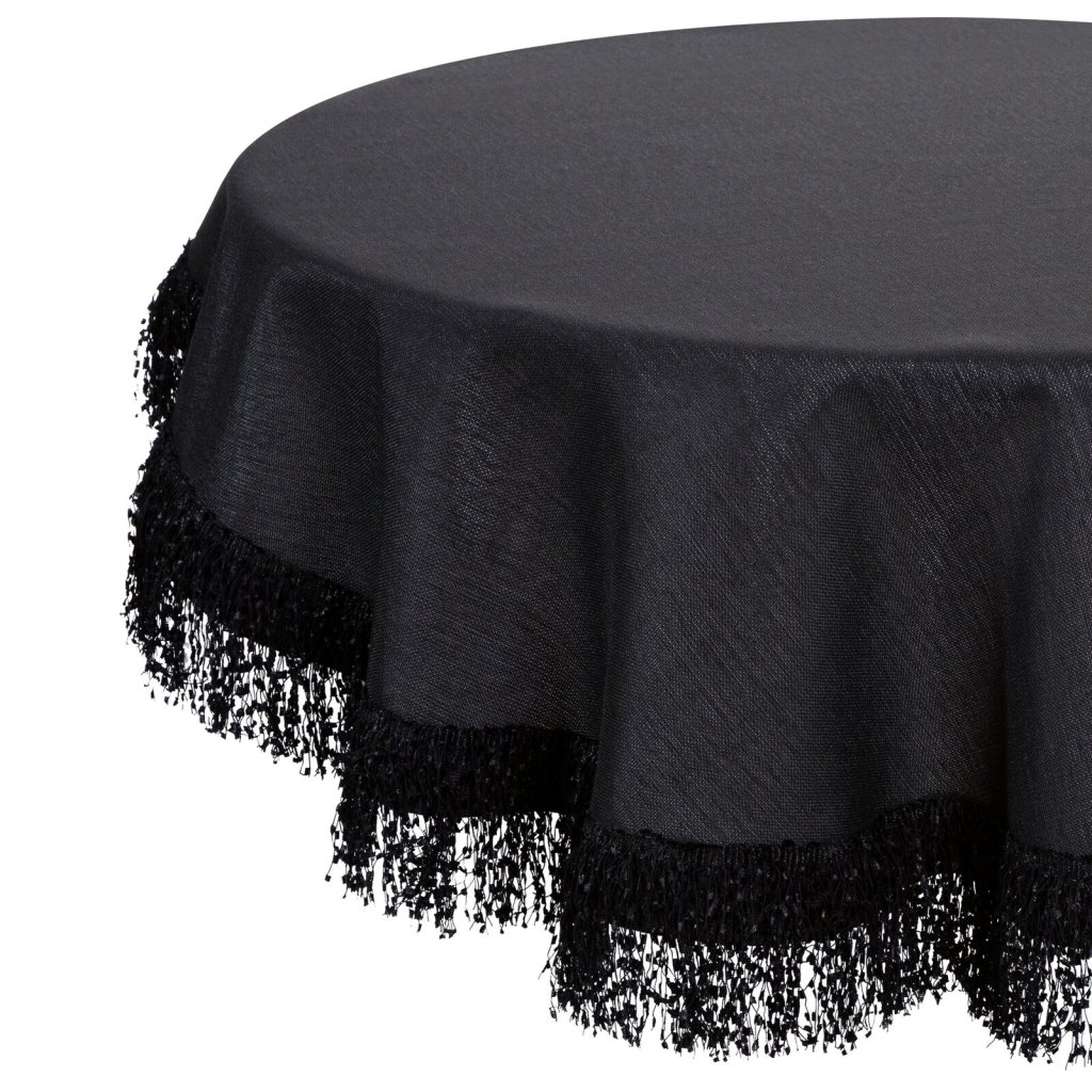 Ubrus TINA je elegantním a stylovým doplňkem každého stolu. Hladký materiál vytváří jemnou a klasickou estetiku. Okraje zdobí nadýchané střapce, které dodávají lehkost a rafinovanost. Díky mírně lesklým třásním získává ubrus nejen estetický vzhled, ale také jemnost a eleganci. Šířka (průměr): 150 cm, barva: černá, hmotnost: 255 GSM, složení: 100% polyester.Doplňkové parametry