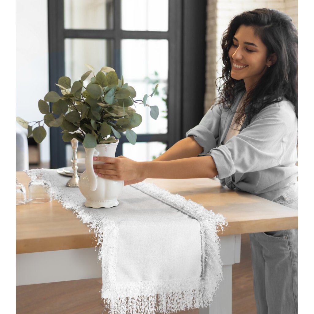 Ubrus TINA je elegantním a stylovým doplňkem každého stolu. Hladký materiál vytváří jemnou a klasickou estetiku. Okraje zdobí nadýchané střapce, které dodávají lehkost a rafinovanost. Díky mírně lesklým třásním získává ubrus nejen estetický vzhled, ale také jemnost a eleganci. Šířka: 140 cm, délka: 220 cm, barva: bílá, hmotnost: 280 GSM, složení: 100% polyester.Doplňkové parametry