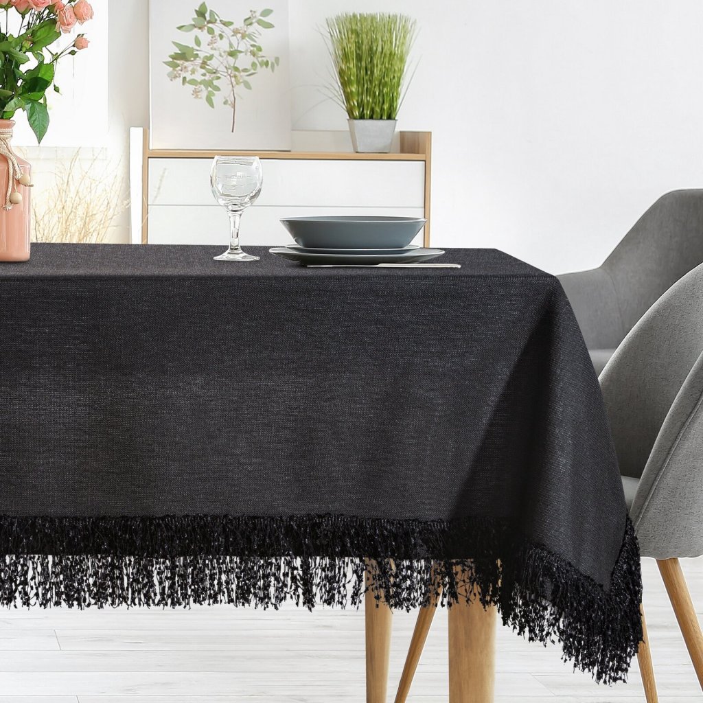 Ubrus TINA je elegantním a stylovým doplňkem každého stolu. Hladký materiál vytváří jemnou a klasickou estetiku. Okraje zdobí nadýchané střapce, které dodávají lehkost a rafinovanost. Díky mírně lesklým třásním získává ubrus nejen estetický vzhled, ale také jemnost a eleganci. Šířka: 140 cm, délka: 220 cm, barva: černá, hmotnost: 255 GSM, složení: 100% polyester.Doplňkové parametry