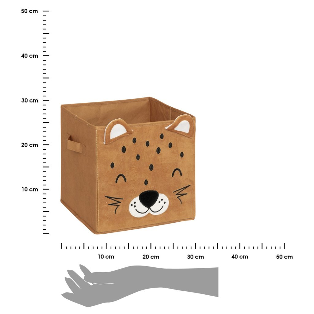 Úložný box Leopard o rozměrech 29 x 29 x 29 cm v hnědé barvě přinese do dětského pokoje kombinaci hravosti, útulnosti a praktické organizace. Díky veselému motivu usměvavého leoparda se tento textilní box stane nejen pomocníkem při udržování pořádku, ale také přitažlivou dekorací v dětském prostoru.