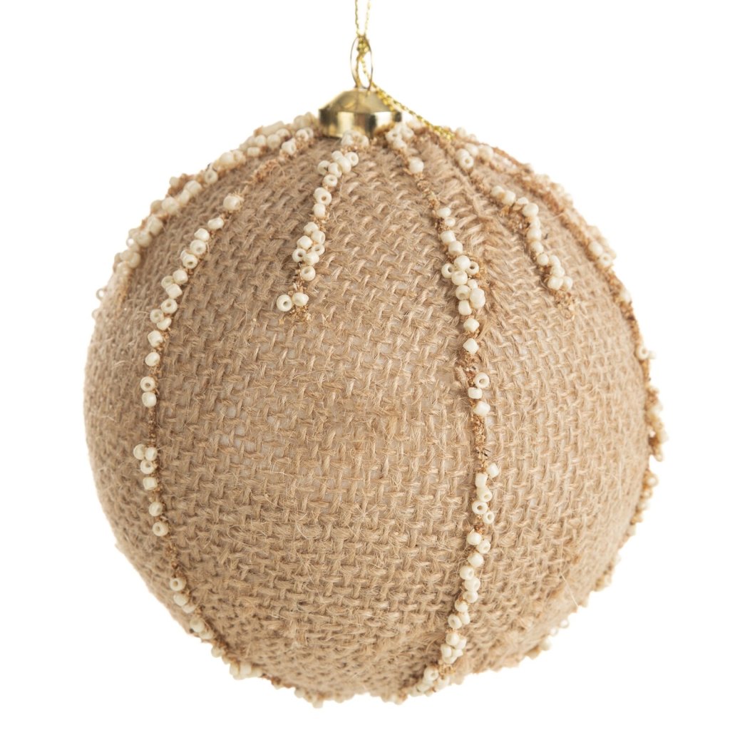 Plastová vánoční koule ve světle hnědém odstínu je originální dekorace v přírodním stylu. Povrch koule je potažen jutou, která jí dodává rustikální charakter, a zdobí ji jemné korálkové detaily, které působí elegantně a stylově.Koule je vyrobena z odolného plastu, který zaručuje její lehkost, nerozbitnost a bezpečné používání. Skvěle se hodí na zdobení vánočních stromků, věnců nebo svátečních aranžmá, zejména v kombinaci s přírodními prvky, jako jsou šišky nebo dřevěné ozdoby.