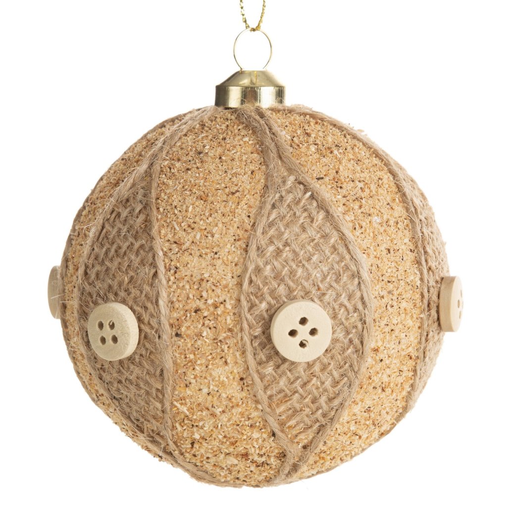 Plastová vánoční koule ve světle hnědé barvě je neobvyklá dekorace, která vnese do vaší výzdoby nádech přírodního stylu. Povrch koule je potažen jutou a ozdoben ozdobnými knoflíky, což jí dodává rustikální a originální charakter.Koule je vyrobena z vysoce kvalitního plastu, díky čemuž je lehká, nerozbitná a bezpečná. Krásně se kombinuje s dalšími přírodními dekoracemi, jako jsou dřevěné ozdoby, šišky nebo brčka, a vytváří tak jedinečné sváteční aranžmá.