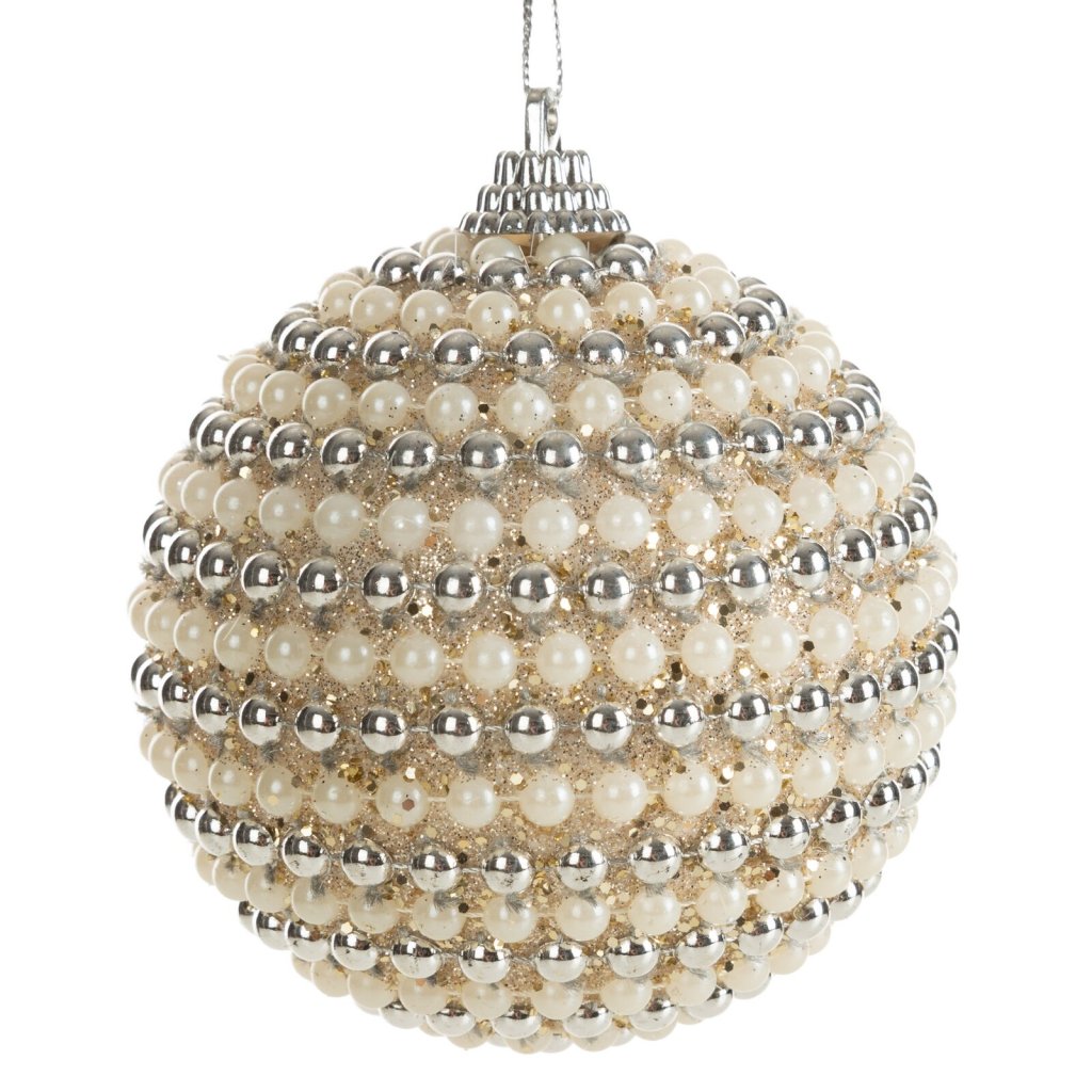 Plastová vánoční koule v krémové barvě je neobvyklá dekorace, která zaujme svým jedinečným designem. Povrch koule je zdoben řadami korálků v krémových a stříbrných odstínech, což jí dodává luxusní a elegantní vzhled.Koule je vyrobena z odolného plastu, díky čemuž je bezpečná a trvanlivá, ale zároveň vypadá stylově a originálně. Bude se krásně vyjímat na vánočním stromku, ve slavnostním věnci nebo aranžmá a krásně se kombinuje s dalšími ozdobami v podobných barvách.