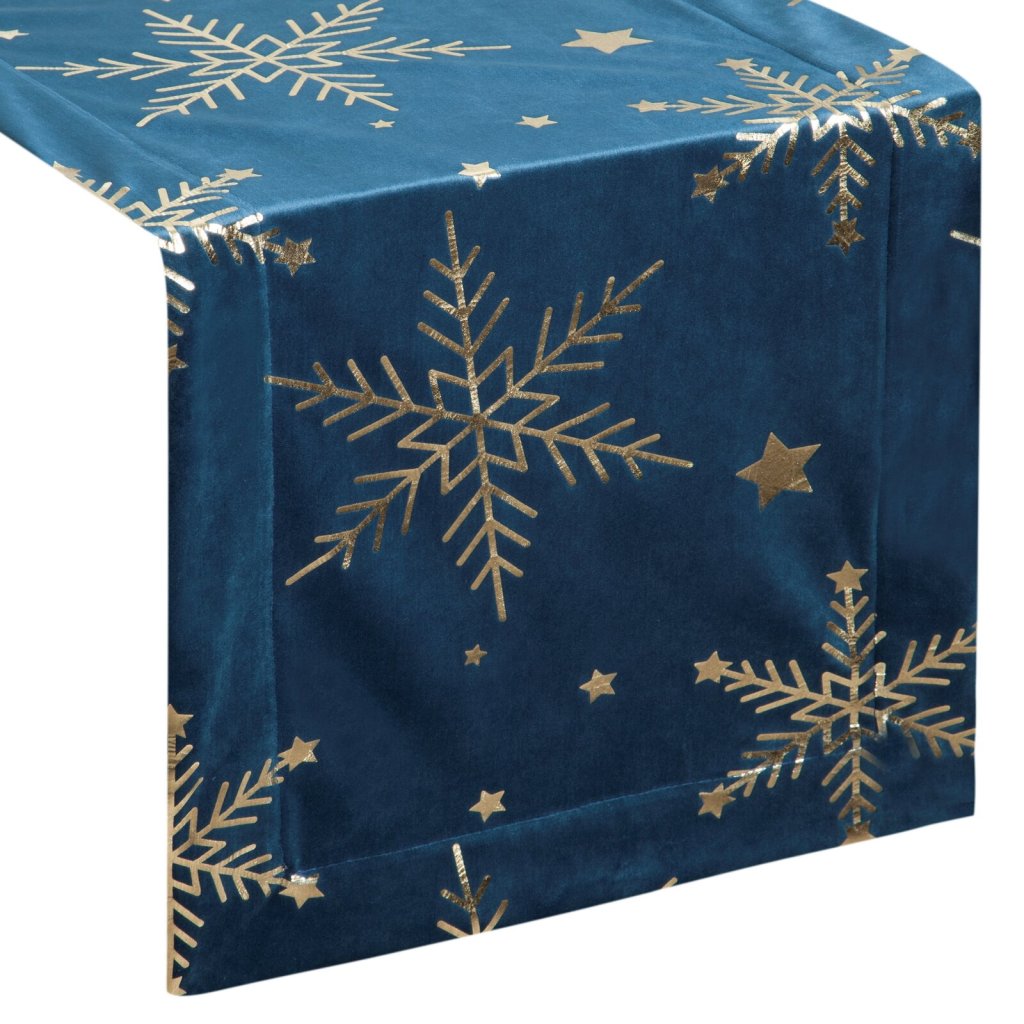 Dodejte sváteční nádech svému stolu pomocí elegantního vánočního běhounu ELEGANCE. Je vyroben z měkkého sametového materiálu, který vypadá luxusně a je příjemný na dotek. Zdobí ho potisk fólie ve zlaté barvě se vzorem sněhových vloček a hvězdiček, který na tmavě modrém pozadí vytváří jedinečný kontrast. Šířka: 40 cm, délka: 140 cm, barva: tmavě modrá a zlatá, hmotnost: 210 GSM, složení: 100% polyester.Buďte první, kdo napíše příspěvek k této položce.