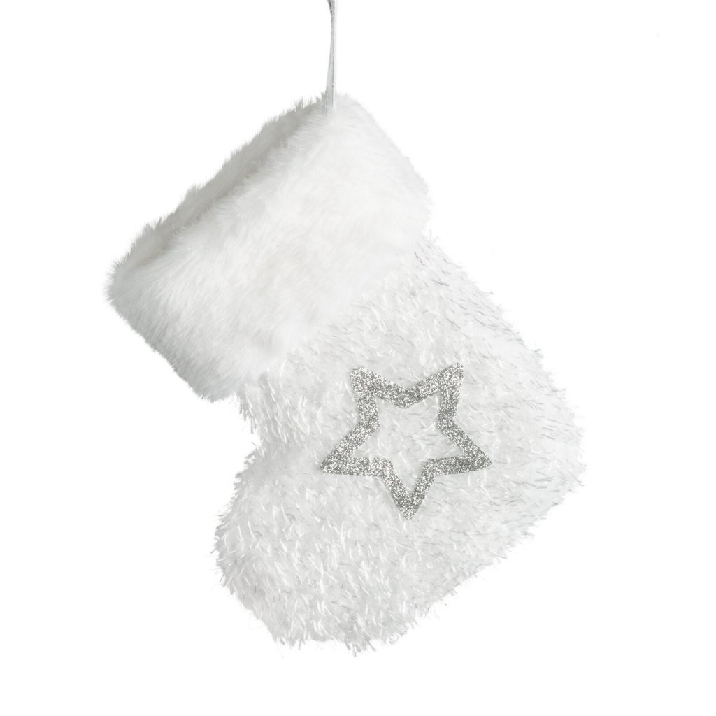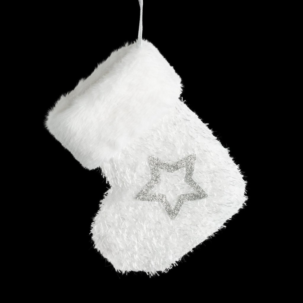 Vánoční ozdoba ve tvaru bačkory, šířka: 15 cm, délka: 19 cm, barva: bílá, složení: plast.Doplňkové parametry