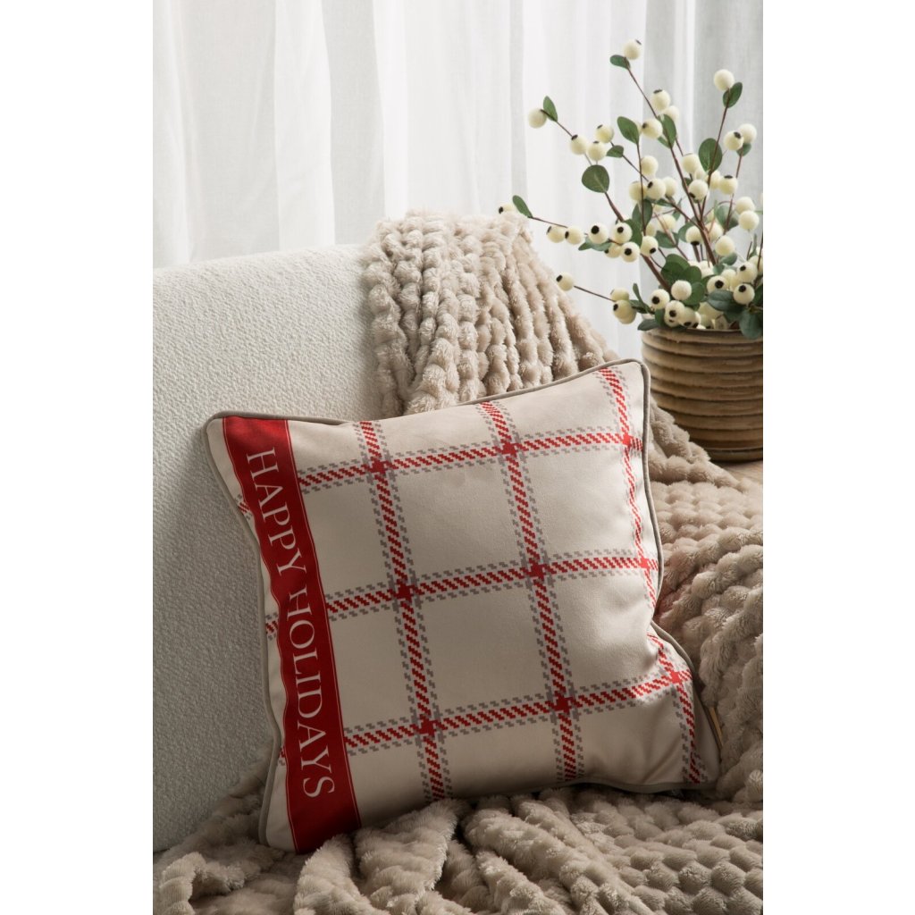 Vánoční dekorační povlak na polštář o rozměrech 45 × 45 cm vnese do vašeho domova svěží zimní nádech a příjemnou sváteční atmosféru. Barva: béžová s červenobílým kostkovaným vzorem a nápisem Happy Holidays. Je vyroben z měkké sametové tkaniny o gramáži 390 GSM, která působí elegantně a je příjemná na dotek. Vysoká kvalita a precizní zpracování zaručují odolnost i estetický dojem. Přehoz je doplněn jemným lemem, který zvýrazňuje jeho tvar, a praktický zip umístěný na boku umožňuje snadné navlékání. V kombinaci s dalšími doplňky z vánoční kolekce vytvoří ve vašem interiéru harmonickou a sváteční atmosféru.Doplňkové parametry
