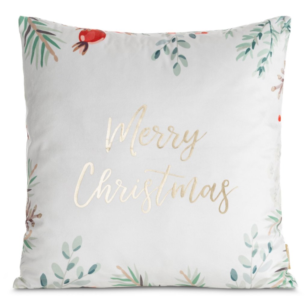 Vánoční dekorační povlak na polštář o rozměrech 45 × 45 cm je elegantním doplňkem, který vnese do vašeho interiéru sváteční kouzlo. Barva: bílá se vzorem větviček a zlatým nápisem Merry Christmas. Je vyroben ze 100% polyesteru o gramáži 200 GSM, měkká sametová tkanina dodává polštářku luxusní a hřejivý charakter. Praktický skrytý zip zajišťuje pohodlné používání a estetický design.Doplňkové parametry