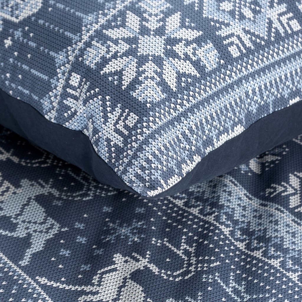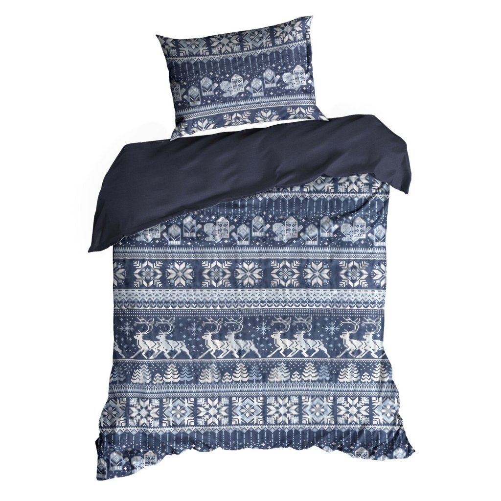 Vneste do své ložnice útulnou a sváteční atmosféru s ložním prádlem FJORD z vysoce kvalitního bavlněného flanelu. Na jedné straně je půvabný skandinávský potisk, zatímco druhá strana zůstává celistvá v tmavě modrém odstínu. Souprava má praktický skrytý zip a její bezpečnost a kvalitu potvrzuje certifikát OEKO-TEX. Šířka: 160 cm, délka: 200 cm, povlak na polštář 2 ks 70x80 cm, barva: vícebarevná, gramáž: 150 GSM, složení: 100% bavlna.Doplňkové parametry