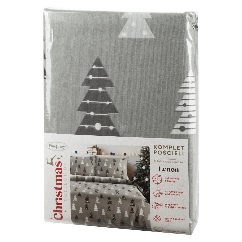 Vneste do své ložnice útulnou a sváteční atmosféru s ložním prádlem LENON z vysoce kvalitního bavlněného flanelu. Měkká a hřejivá tkanina poskytuje pohodlí za chladných nocí a okouzlující potisk vánočního stromku dodává sváteční kouzlo a útulnost. Souprava má praktický skrytý zip a její bezpečnost a kvalitu potvrzuje certifikát OEKO-TEX. Šířka: 160 cm, délka: 200 cm, povlak na polštář 2 ks 70x80 cm, barva: vícebarevná, gramáž: 150 GSM, složení: 100% bavlna.Doplňkové parametry