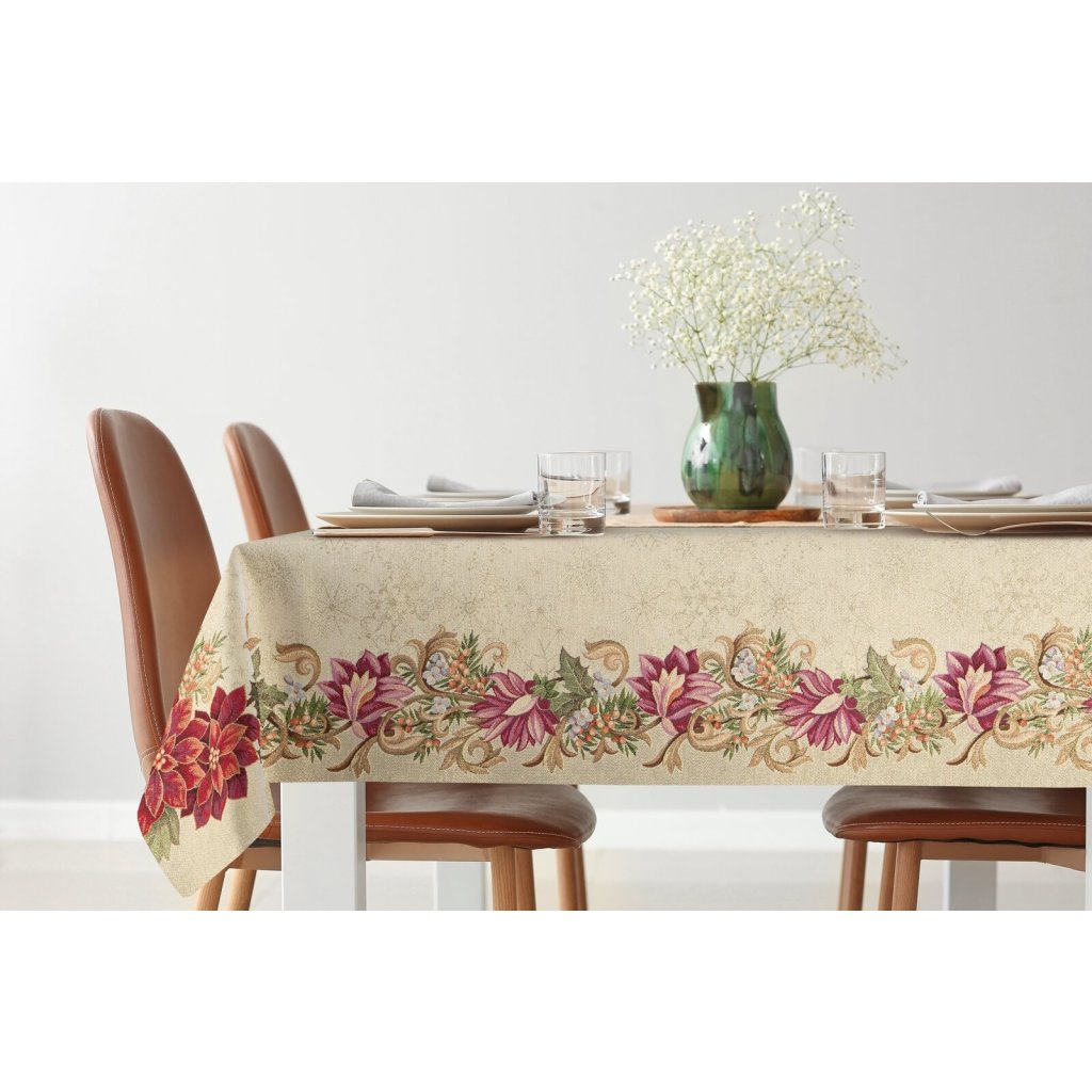 Gobelínový ubrus s kovovou nití a vánočním vzorem, šířka: 50 cm, délka: 110 cm, barva: vícebarevná, hmotnost: 315 GSM, složení: 70 % polyester, 23 % bavlna, 4 % kovová nit, 3 % akryl.Doplňkové parametry