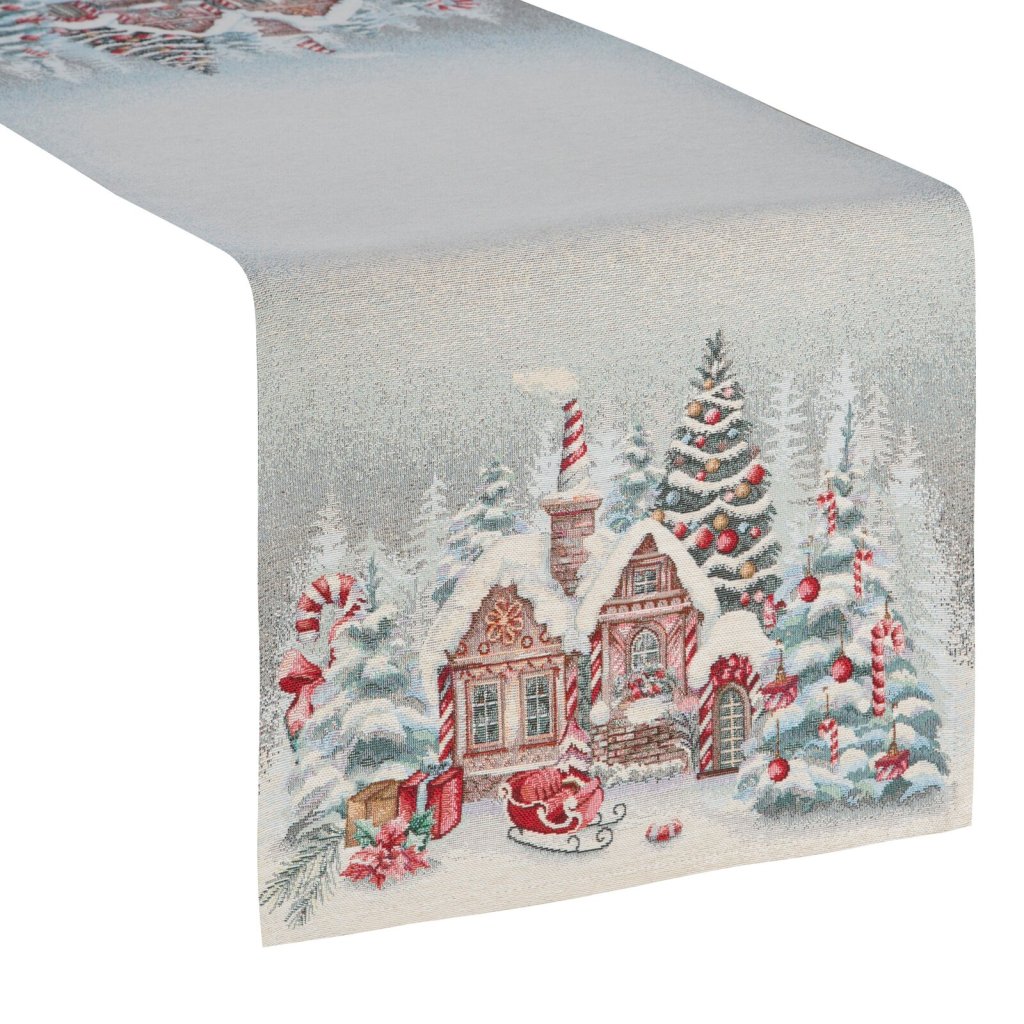 Dopřejte svému stolu kouzelnou sváteční atmosféru s tímto gobelínovým běhounem. Bohatě zdobený zimním motivem domečku, zasněžených stromků, ozdob a saní působí útulně a nostalgicky. Měkký popelínový podklad v kombinaci s detailním barevným vzorem vytváří elegantní kontrast a dodá vašemu interiéru sváteční kouzlo. Šířka: 45 cm, délka: 140 cm, barva: vícebarevná, gramáž: 400 GSM, složení: 68 % polyester, 32 % bavlna.Doplňkové parametry