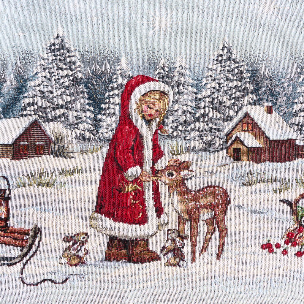 Gobelínový ubrus s vánočním vzorem zasněžené vesnice, šířka: 45 cm, délka: 140 cm, hmotnost: 315 GSM, barva: vícebarevná, složení: 53 % polyester, 40 % bavlna, 4 % kovová nit, 3 % akryl.Doplňkové parametry