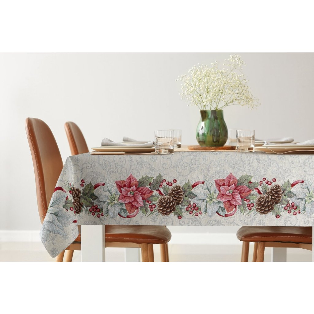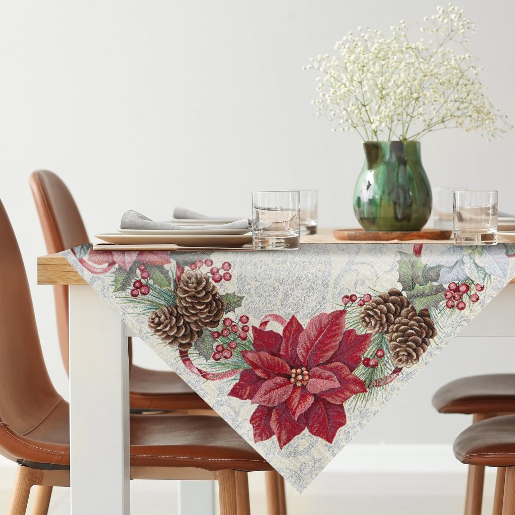 Gobelínový ubrus s kovovou nití a vánočním vzorem, šířka: 100 cm, délka: 100 cm, barva: vícebarevná, hmotnost: 315 GSM, složení: 53 % polyester, 40 % bavlna, 4 % kovová nit, 3 % akryl.Doplňkové parametry