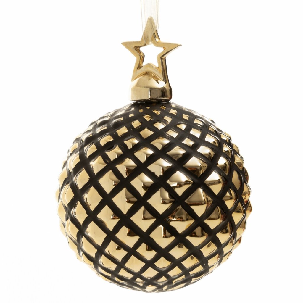 Skleněná koule s ozdobným keramickým přívěskem, barva: zlatá a černá, složení: sklo.Doplňkové parametry