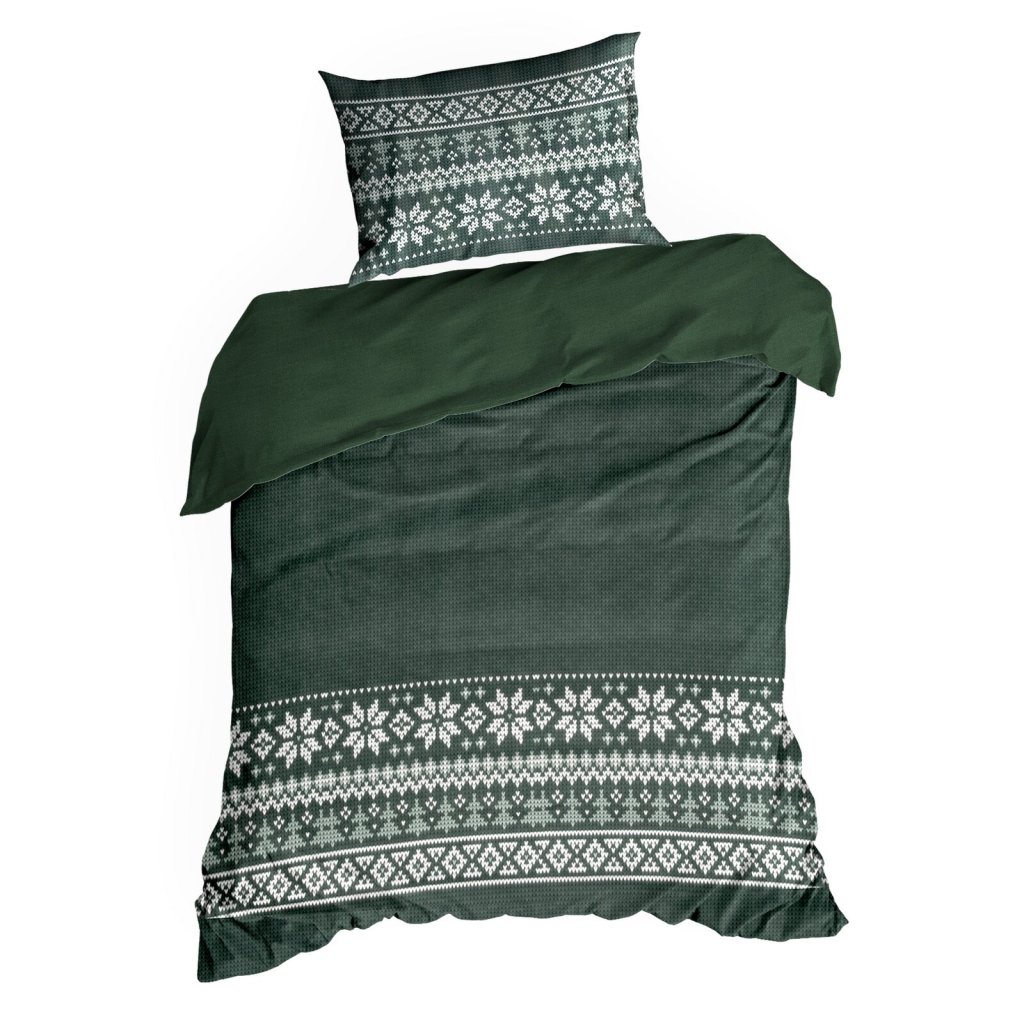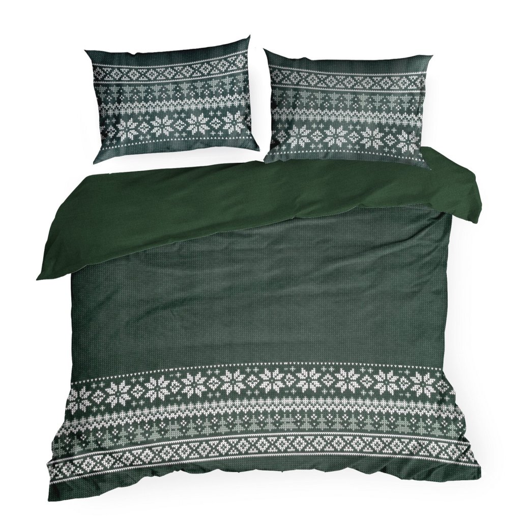 Sada povlečení z mikrovlákna JEREMY s vánočním motivem v zelené barvě. Vyrobeno z vysoce kvalitního polyesteru, měkkého na dotek, lehkého a rychleschnoucího. Ideální pro zimní období, s krásným vzorem sněhových vloček a vánočních stromků. Šířka: 160 cm, délka: 200 cm, povlak na polštář 2 ks 70x80 cm, barva: vícebarevná, gramáž: 75 GSM, složení: 100% polyester.Doplňkové parametry