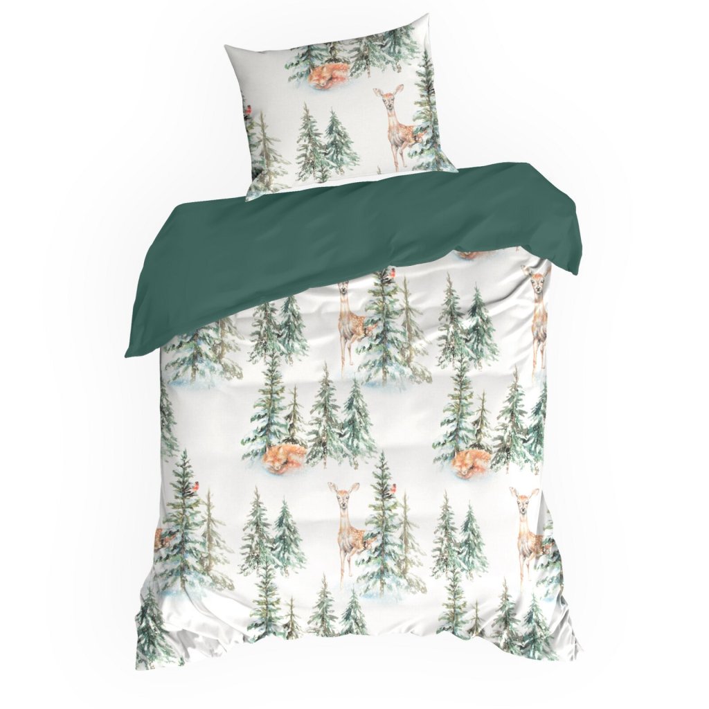 Vneste do své ložnice slavnostní atmosféru díky ložní soupravě DEER z vysoce kvalitní bavlny Renforcé. Na jedné straně je klasický potisk zimního lesa, zatímco druhá strana má pevnou část v zeleném odstínu, která dokonale doplňuje zimní dekor. Souprava má praktický skrytý zip a její bezpečnost a kvalitu potvrzuje certifikát OEKO-TEX. Šířka: 220 cm, délka: 200 cm, povlak na polštář 2 ks 70x80 cm, barva: vícebarevná, gramáž: 105 GSM, složení: 100% bavlna.Doplňkové parametry