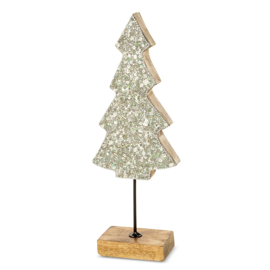 Figurka vánočního stromku o rozměrech 11 × 5 cm ve stříbrné barvě je okouzlujícím doplňkem, který dodá vašemu interiéru sváteční jiskru a útulnou atmosféru. Je vyrobena z kombinace materiálů 60 % dřeva, 30 % plastu a 10 % kovu. Stromeček je upevněn na kovové noze s masivním dřevěným podstavcem, který mu dodává stabilitu a elegantní vzhled. Povrch je zdoben lesklými flitry a korálky, které se na světle krásně třpytí a vnášejí do prostoru jemný sváteční půvab. Figurka vypadá krásně na polici, komodě nebo svátečním stole a v kombinaci s dalšími dekoracemi vytváří harmonickou a stylovou vánoční kompozici plnou tepla a radosti.Doplňkové parametry