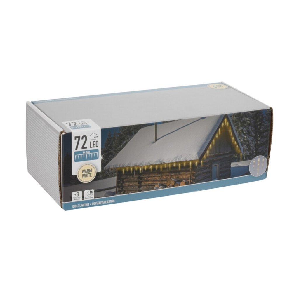 Vánoční LED světélka ve tvaru rampouchů o délce 6,9 metru a 72 teplobílými diodami vytvoří útulnou a slavnostní atmosféru, která podtrhne kouzlo zimních svátků. Tato elegantní světelná dekorace je ideální pro ozdobení oken, balkonu, terasy či výkladu obchodu a svým designem rampouchů dodá prostoru jemný, teplý lesk. Díky harmonickému světlu se stane působivým doplňkem, který upoutá na první pohled.Osvětlení obsahuje 24 rampouchů. Dvanáct menších se dvěma diodami a dvanáct větších se čtyřmi diodami. Teplé bílé světlo vytváří příjemnou a klidnou atmosféru, která dodává prostoru pocit domova. Světýlka nabízejí 8 režimů svícení a paměťovou funkci , která si zapamatuje poslední nastavení, takže při opětovném zapnutí se rozsvítí ve stejném režimu. Jsou vybaveny také časovačem se systémem 6 hodin svícení a 18 hodin vypnutí, což přináší pohodlí a energetickou úsporu.