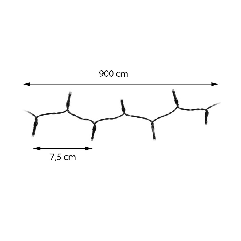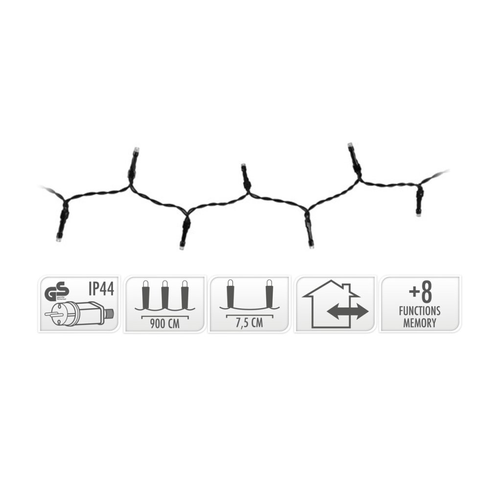 Světelný řetěz má délku 9 metrů a doplňuje jej napájecí kabel o délce 3 metry . Mezi jednotlivými světélky je rozestup přibližně 15 centimetrů a každá žárovka má velikost 5 mm. Osvětlení splňuje stupeň ochrany IP44 , což zaručuje bezpečné používání v interiéru i exteriéru. Světýlka jsou napájena přímo ze sítě a vynikají spolehlivým provozem, nízkou spotřebou energie a dlouhou životností .