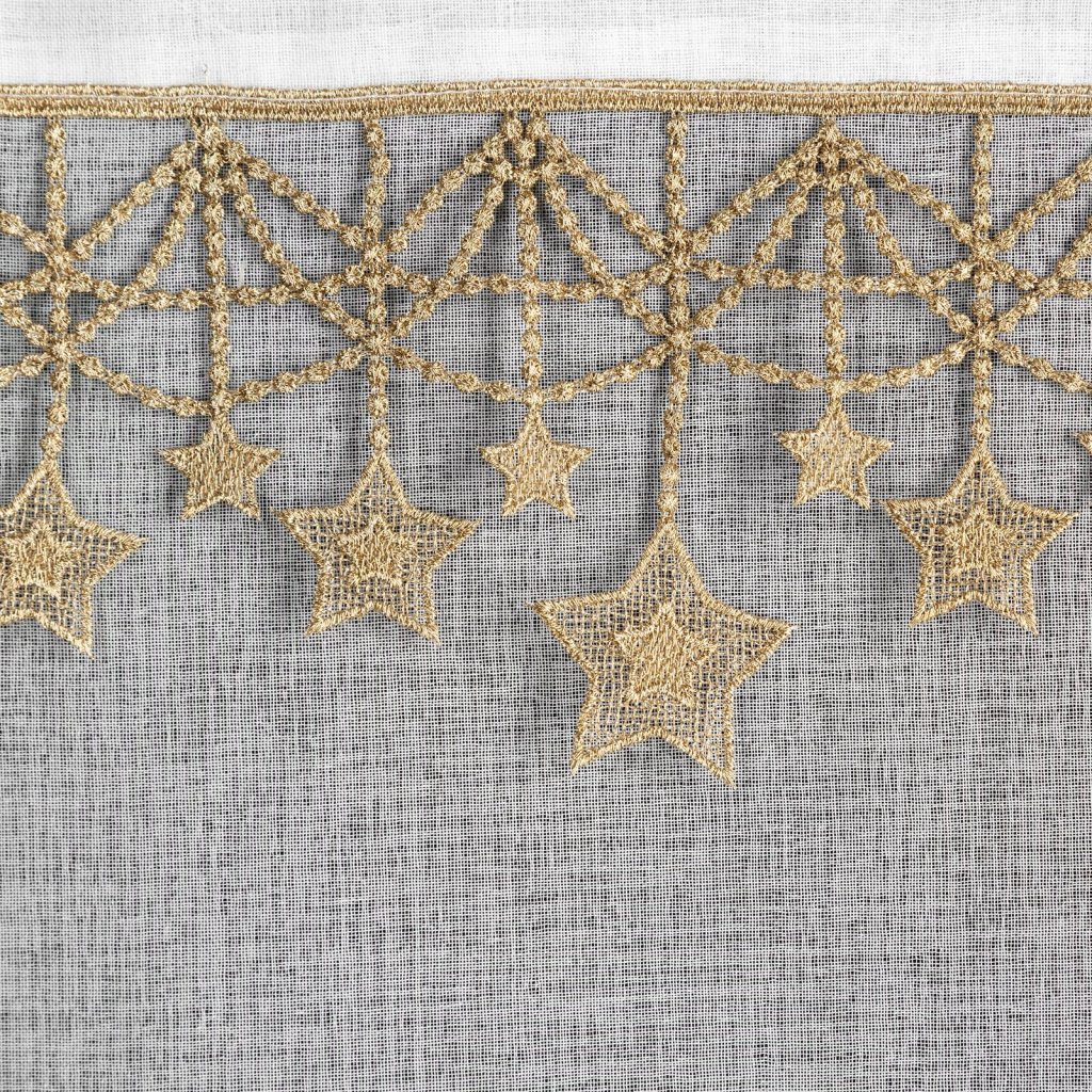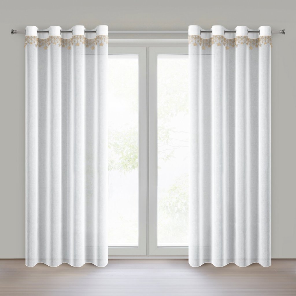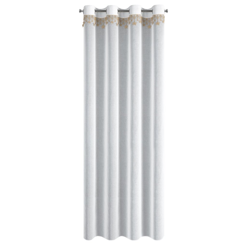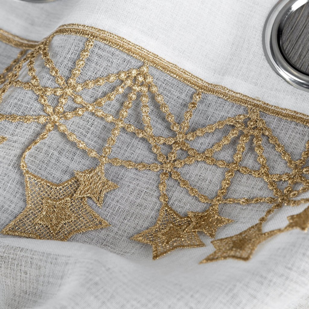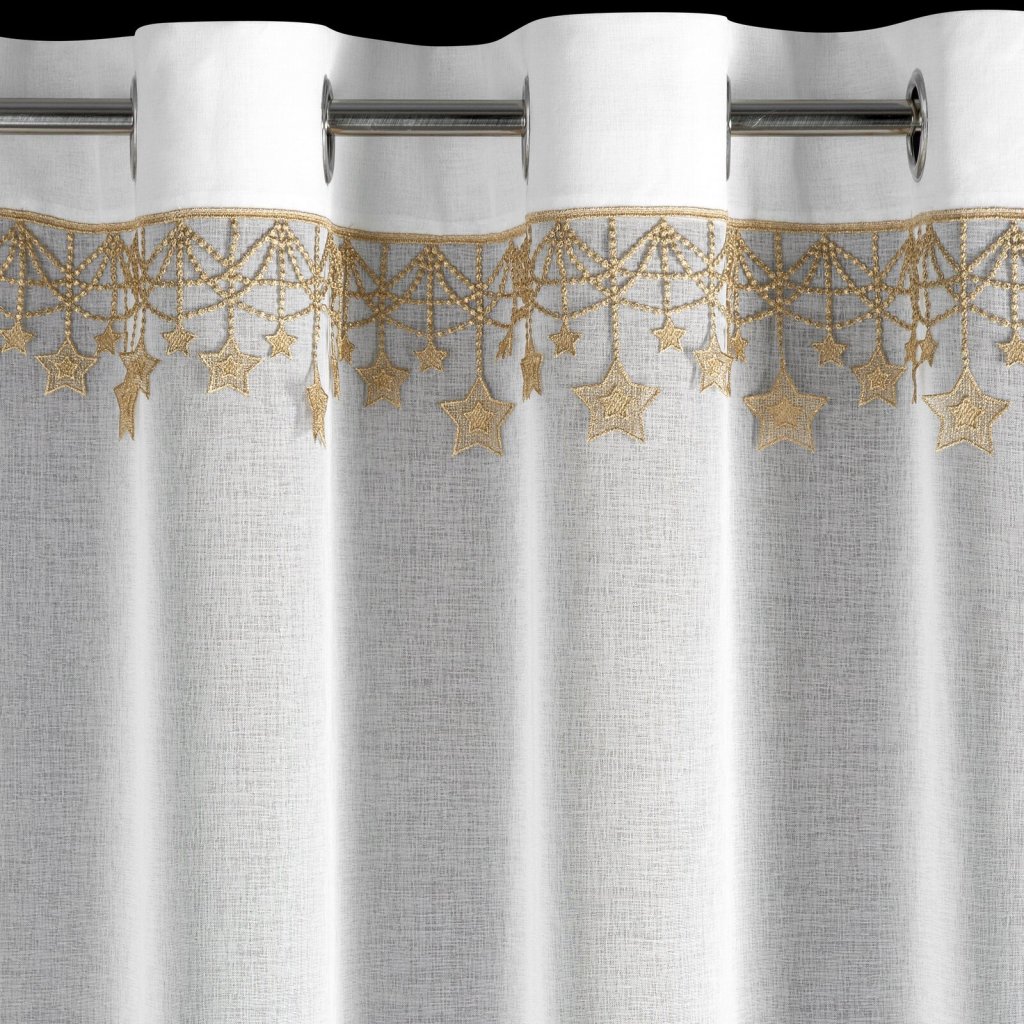 Hotová záclona se svátečním lemováním, šířka 140 cm, délka 250 cm, barva bílá. Hmotnost: 75 GSM, složení: 100% polyester, barva hvězd: zlatá.Doplňkové parametry