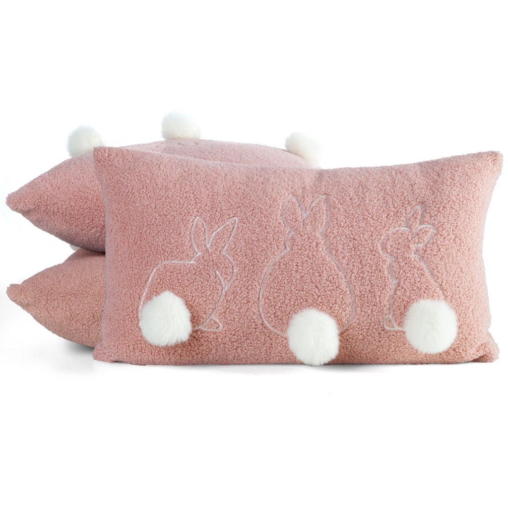 Dodejte svému interiéru kouzlo s velikonočním dekoračním povlakem na polštář z látky boucle. Jeho příjemná struktura dodá interiéru útulný pocit a vyšívaný vzor roztomilých zajíčků dotváří vzhled povlaku. Vzhled doplňují nadýchané bambule imitující zaječí ocásky. Šířka: 30 cm, délka: 50 cm, barva: růžová, hmotnost: 220 GSM, složení: 100 % polyester.Doplňkové parametry