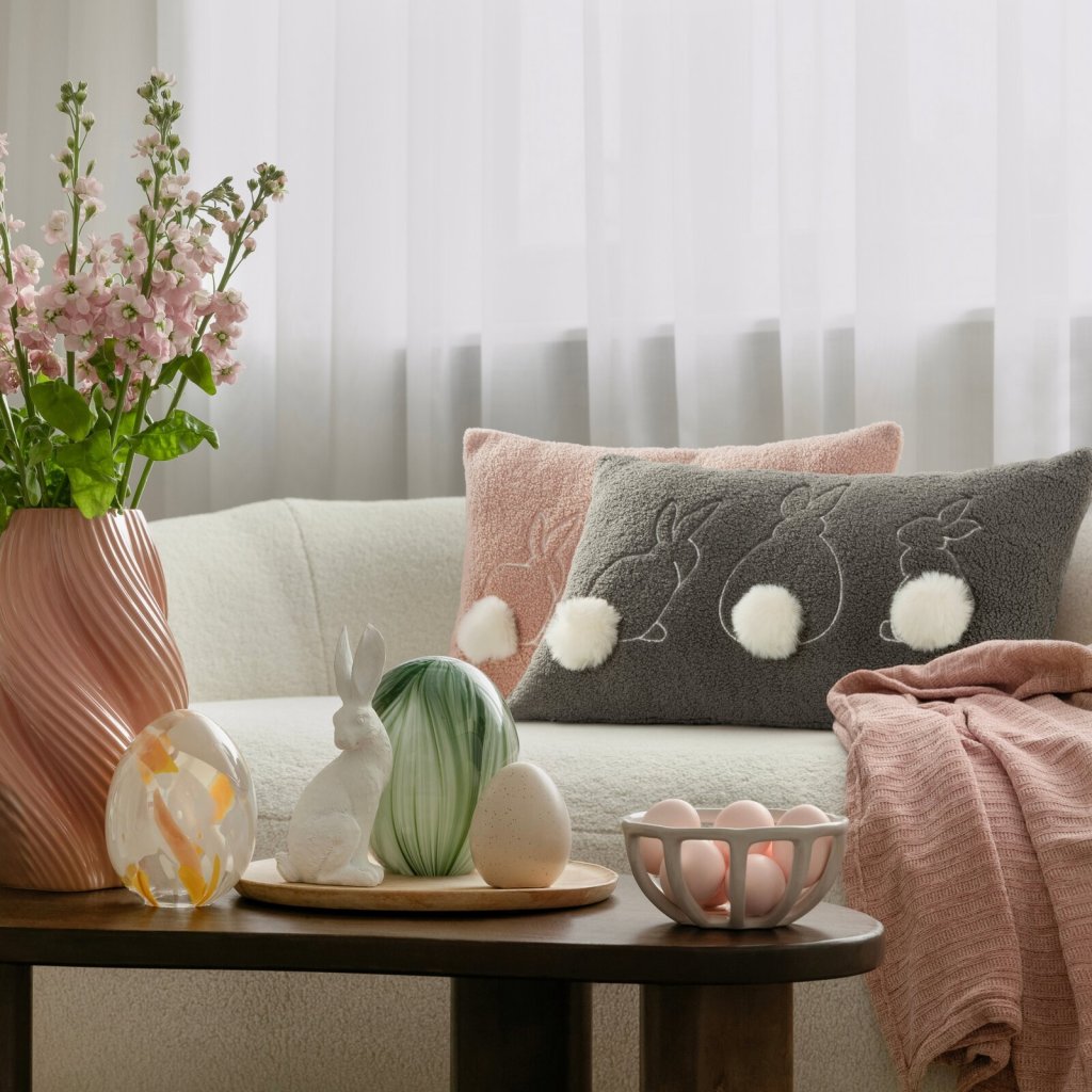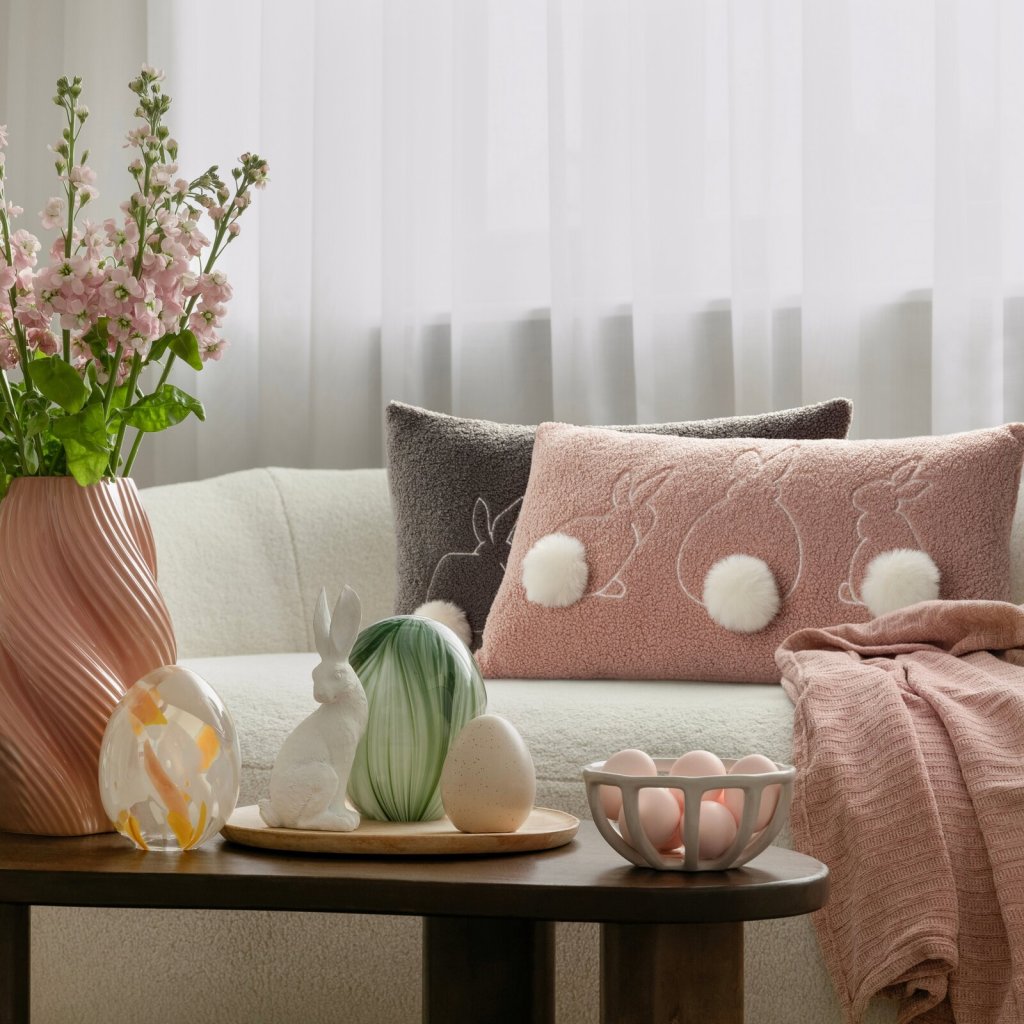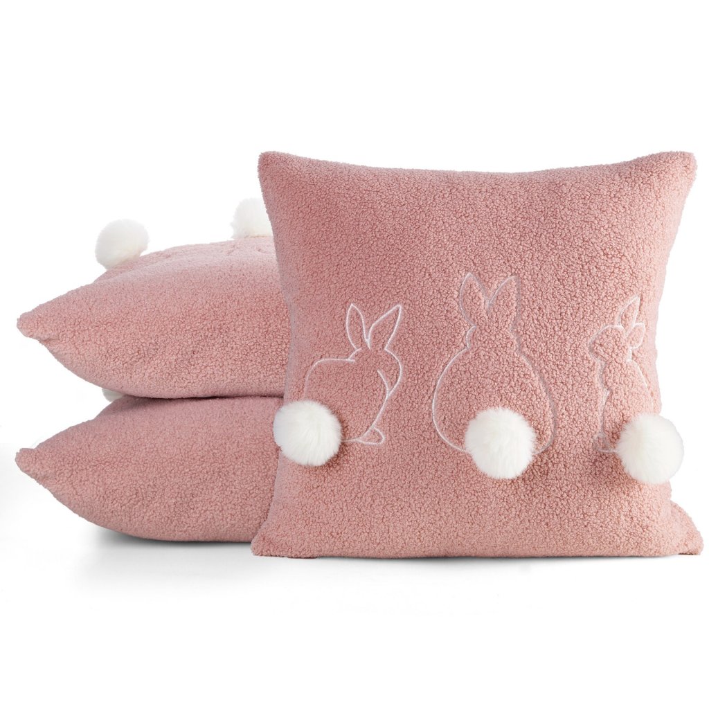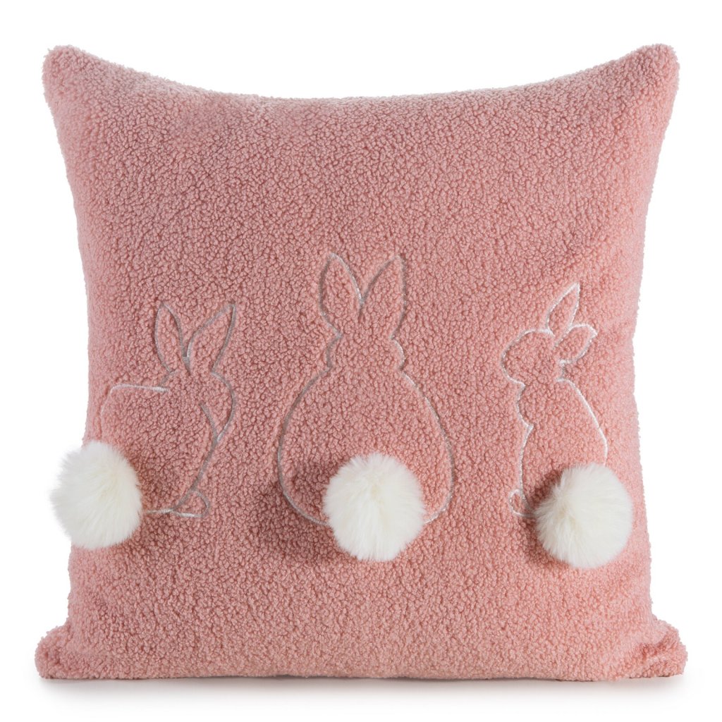 Dodejte svému interiéru kouzlo s velikonočním dekoračním povlakem na polštář z bucle tkaniny. Jeho příjemná struktura dodá interiéru útulný pocit a vyšívaný vzor roztomilých zajíčků dotváří vzhled povlaku. Vzhled doplňují nadýchané bambule imitující zaječí ocásky. Šířka: 45 cm, délka: 45 cm, barva: růžová, hmotnost: 220 GSM, složení: 100 % polyester.Doplňkové parametry