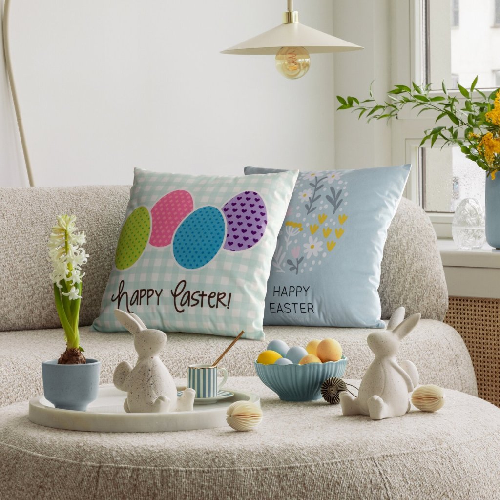 Vneste do svého interiéru sváteční jarní atmosféru s elegantním dekoračním povlakem na polštář s velikonočním motivem. Je vyroben z měkké, na dotek příjemné velurové tkaniny a dodá vašemu interiéru útulný a stylový ráz. Jeho povrch zdobí potisk, který skvěle doplňuje velikonoční aranžmá. Výměna je možná díky skrytému zipu. Šířka: 45 cm, délka: 45 cm, barva: vícebarevná, hmotnost: 140 GSM, složení: 100% polyester.Doplňkové parametry