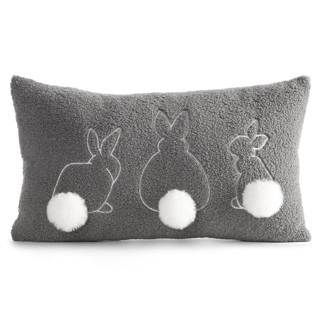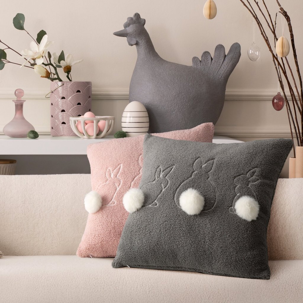 Dodejte svému interiéru kouzlo s velikonočním dekoračním povlakem na polštář z látky boucle. Jeho příjemná struktura dodá interiéru útulný pocit a vyšívaný vzor roztomilých zajíčků dotváří vzhled povlaku. Vzhled doplňují nadýchané bambule imitující zaječí ocásky. Šířka: 30 cm, délka: 50 cm, barva: šedá, hmotnost: 220 GSM, složení: 100 % polyester.Doplňkové parametry