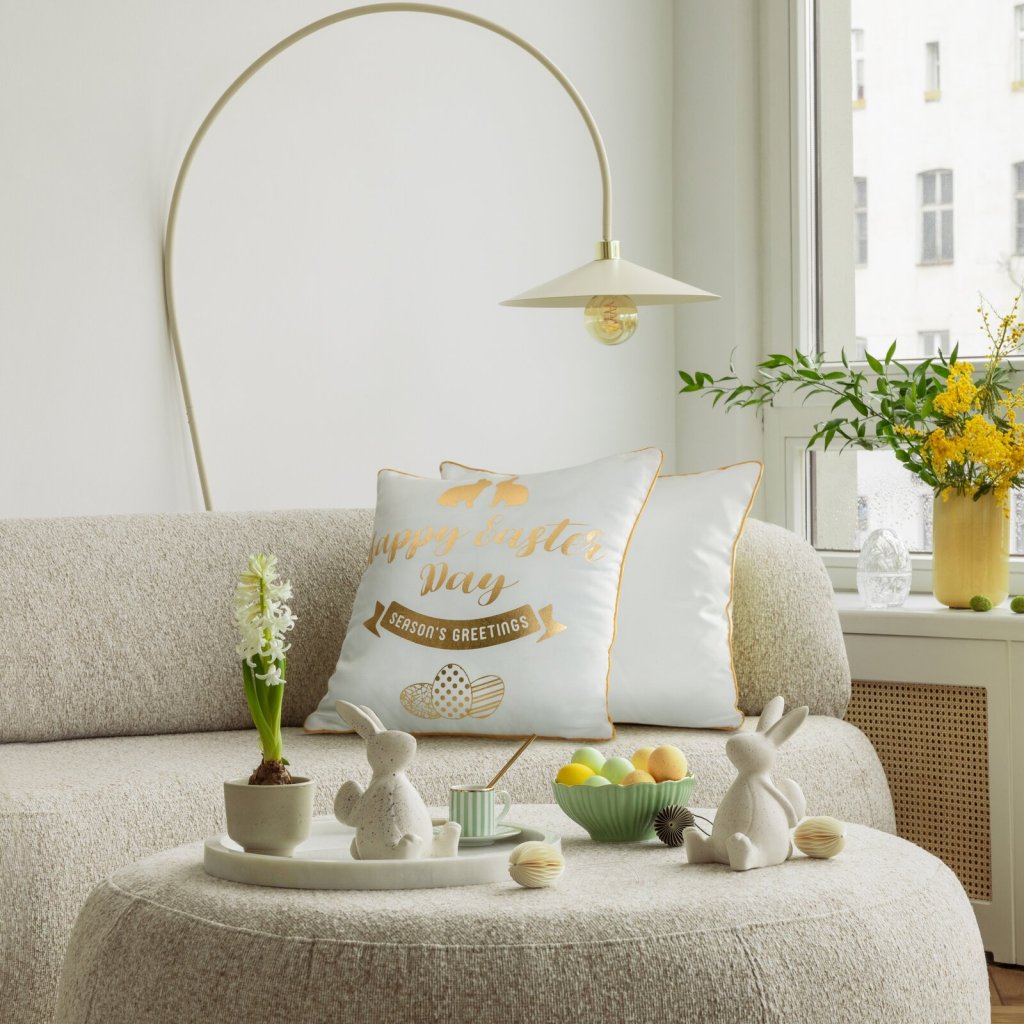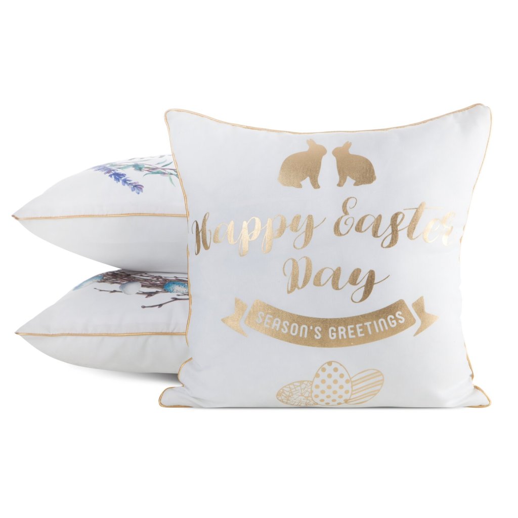 Dodejte svému interiéru elegantní a sváteční nádech s velikonočním dekoračním povlakem na polštář z měkké a příjemné látky. Jeho povrch zdobí stylový zlatý potisk, který se krásně třpytí a dodává povlaku na polštář rafinovaný charakter. Povlak na polštář je na okrajích zakončen kontrastním lemováním, které umocňuje jeho elegantní design a dodává celku jedinečnou estetiku. Výměna je možná díky skrytému zipu. Šířka: 45 cm, délka: 45 cm, barva: bílá a zlatá, hmotnost: 140 GSM, složení: 100% polyester.Doplňkové parametry