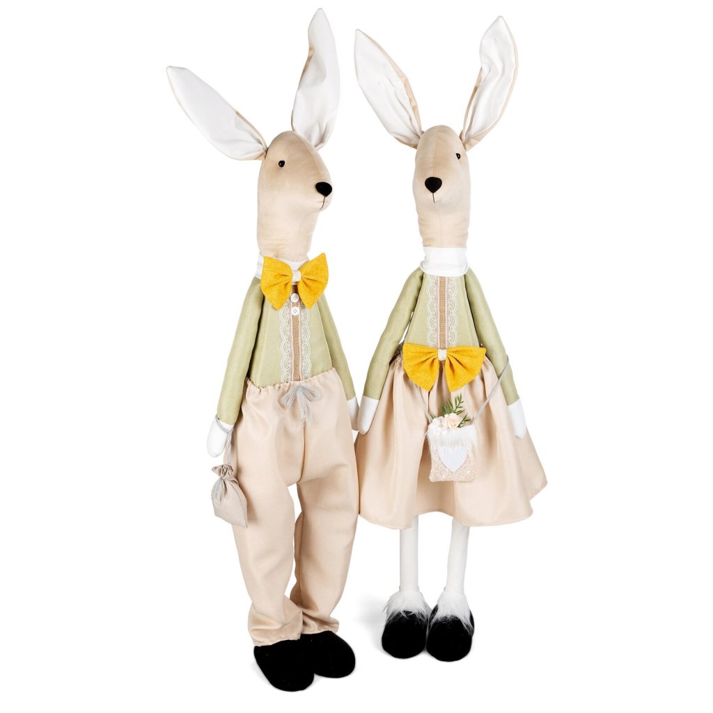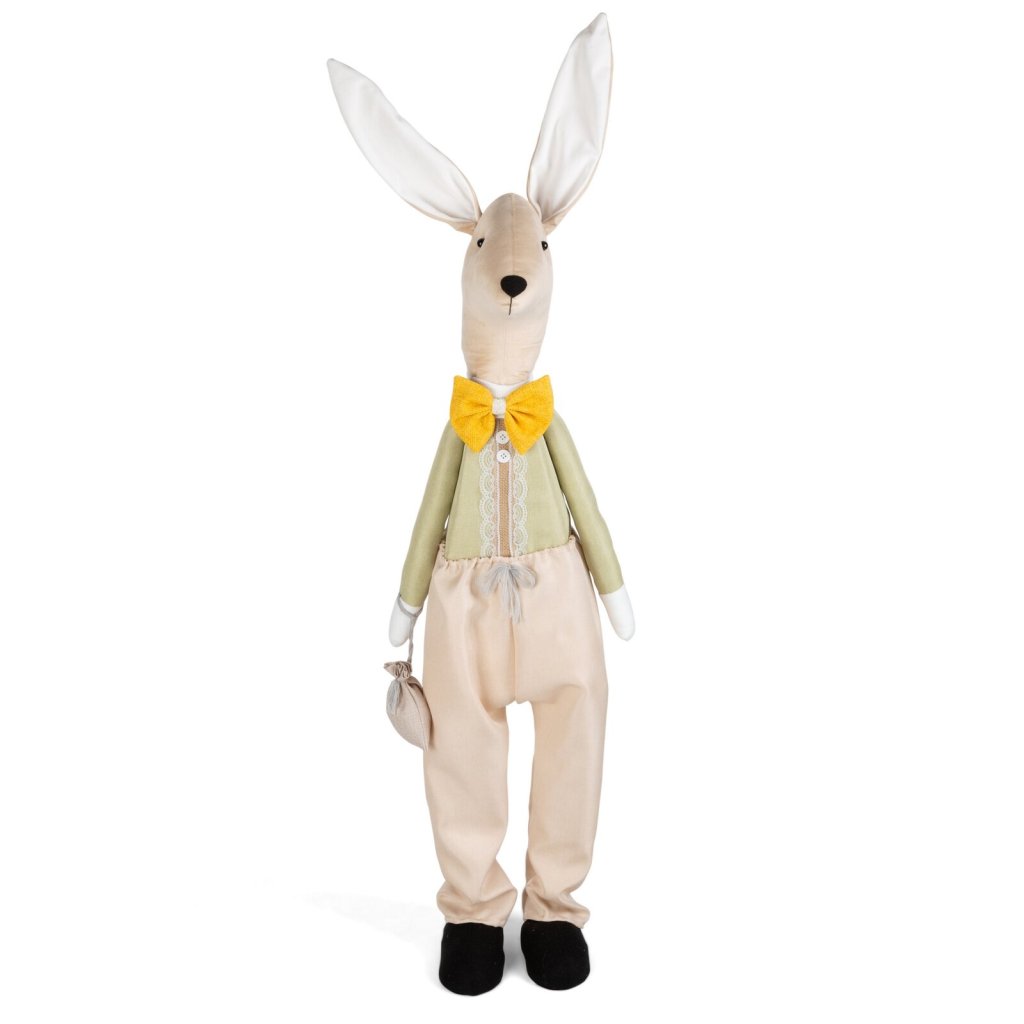 Zajíček je oblečen do elegantních krémových kalhot a odpovídající košile s roztomilým motýlkem u krku. Na nohou má černé boty, které vypadají elegantně, a v ruce drží pytlík s velikonoční nádivkou. Díky pečlivému zpracování a nadčasovému stylu je ideálním doplňkem jarních a velikonočních dekorací. šířka: 28 cm, délka: 100 cm, barva: pestrobarevná, složení: polyester.Doplňkové parametry