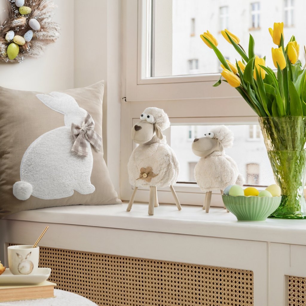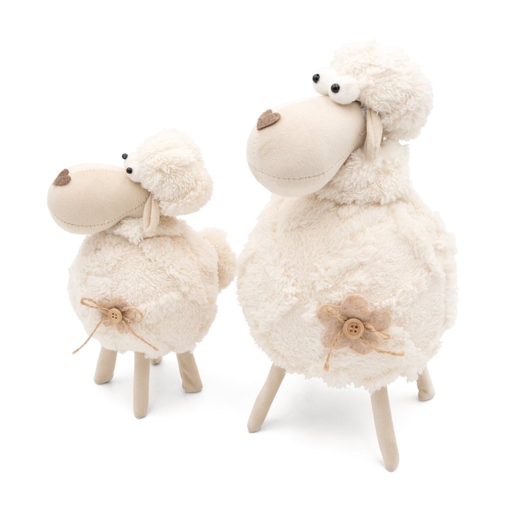 Velikonoční plyšová ovečka s nadýchaným, krémově bílým tělem. Má kulaté nadýchané tělo, které vypadá měkce a lákavě. Hlava a nohy jsou vyrobeny z hladké béžové látky, zatímco její protáhlý čumáček má jako nos přišité malé srdíčko. Oči jsou velké, kulaté a mírně vystouplé, což jí dodává hravý výraz. Na boku těla má ozdobnou látkovou květinu s dřevěným knoflíkem uprostřed. Celkově ovečka působí jako něžná a milá dekorace. Šířka: 17 cm, délka: 32 cm, barva: krémová a béžová, složení: 70 % polyester, 30 % kov.Doplňkové parametry