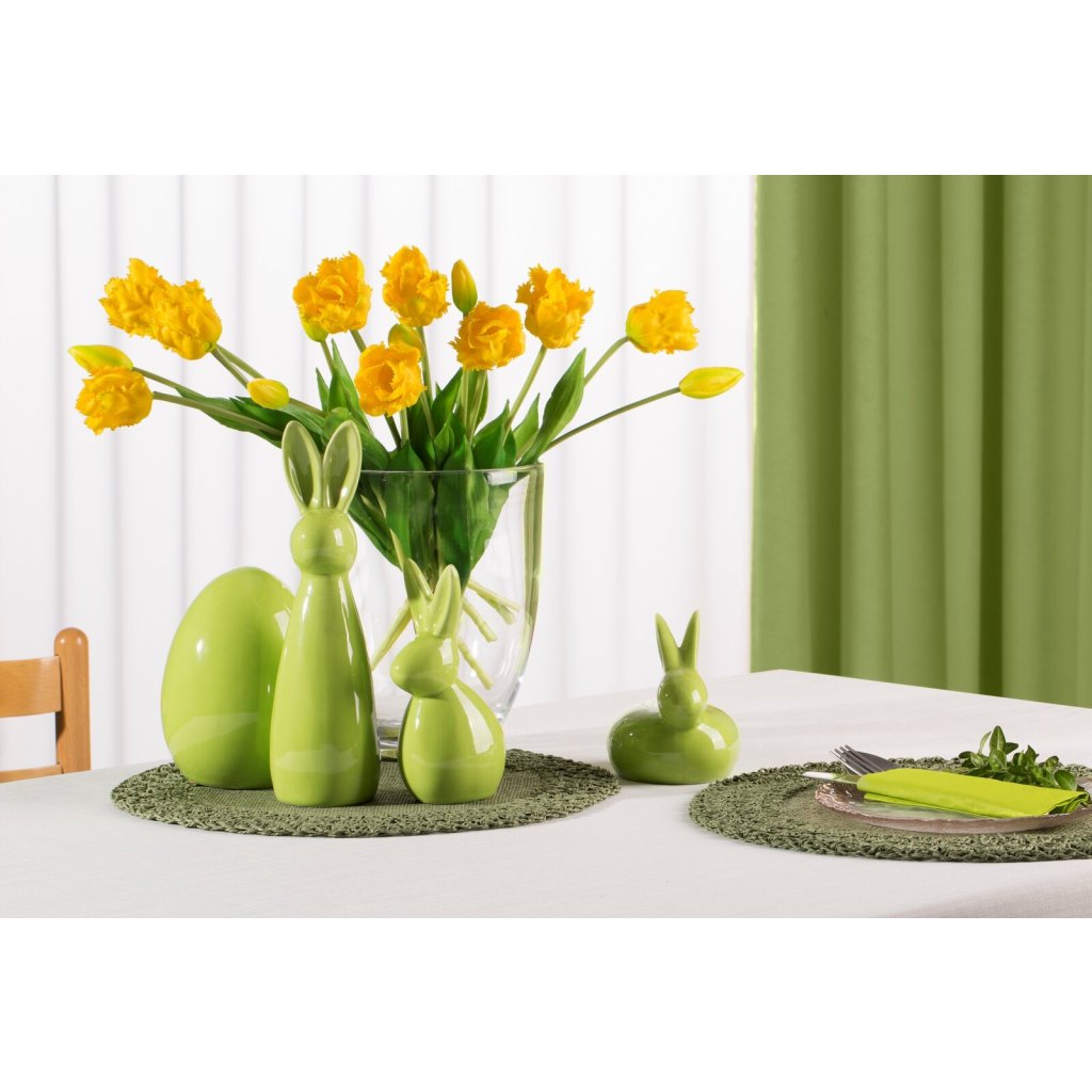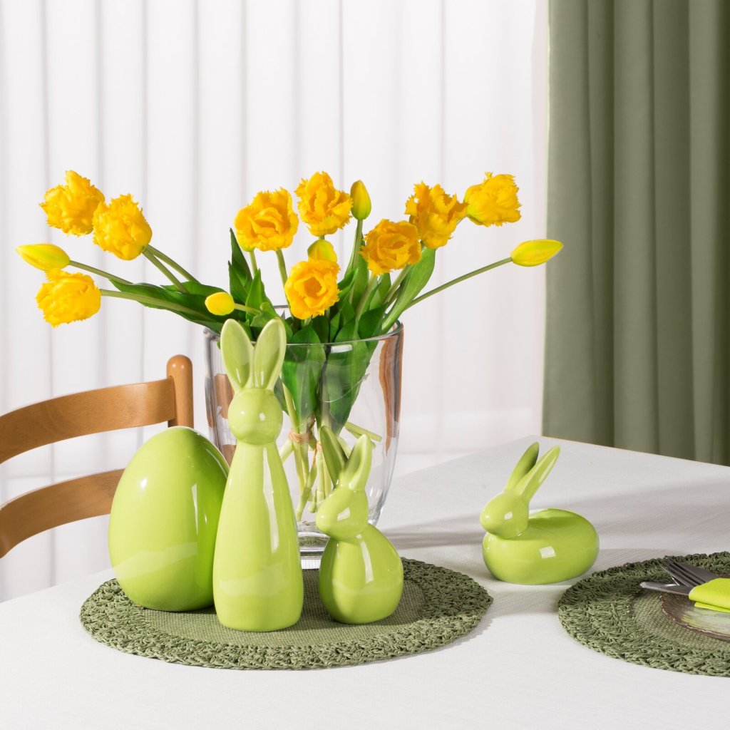Oživte svou velikonoční výzdobu rozkošným hliněným zajíčkem v intenzivní, lesklé zelené barvě! Jeho lesklý povrch krásně odráží světlo a dodá vašemu interiéru teplo a sváteční náladu. Díky pečlivému zpracování a klasickému tvaru bude figurka skvěle sloužit jako dekorace. Šířka: 14 cm, délka: 13 cm, barva: zelená, složení: keramická hlína.Doplňkové parametry