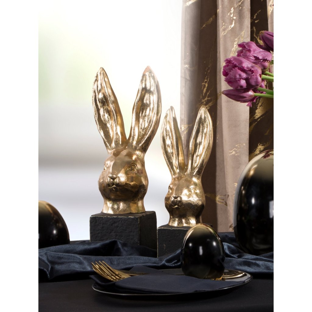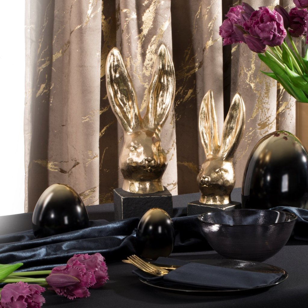 Dodejte své velikonoční výzdobě šmrnc jedinečnou keramickou figurkou zajíčka z hlíny. Díky ručně vyráběným detailům a jemné struktuře je figurka jedinečně okouzlující a hřejivá. Šířka: 9 cm, délka: 24 cm, barva: černá a zlatá, složení: keramická hlína.Doplňkové parametry