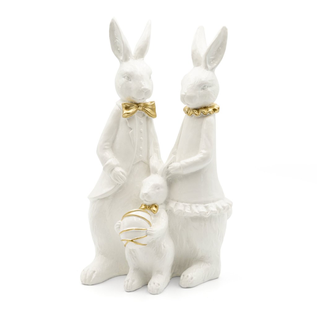 Dodejte svému interiéru jedinečný sváteční nádech s touto rozkošnou velikonoční figurkou s rodinou zajíčků. Je vyrobena z polyesterové pryskyřice a zaujme pečlivými detaily a elegantními zlatými akcenty, které jí dodávají jemný lesk a rafinovaný charakter. Šířka: 18 cm, délka: 32 cm, barva: bílá a zlatá, složení: polyesterová pryskyřice.Doplňkové parametry