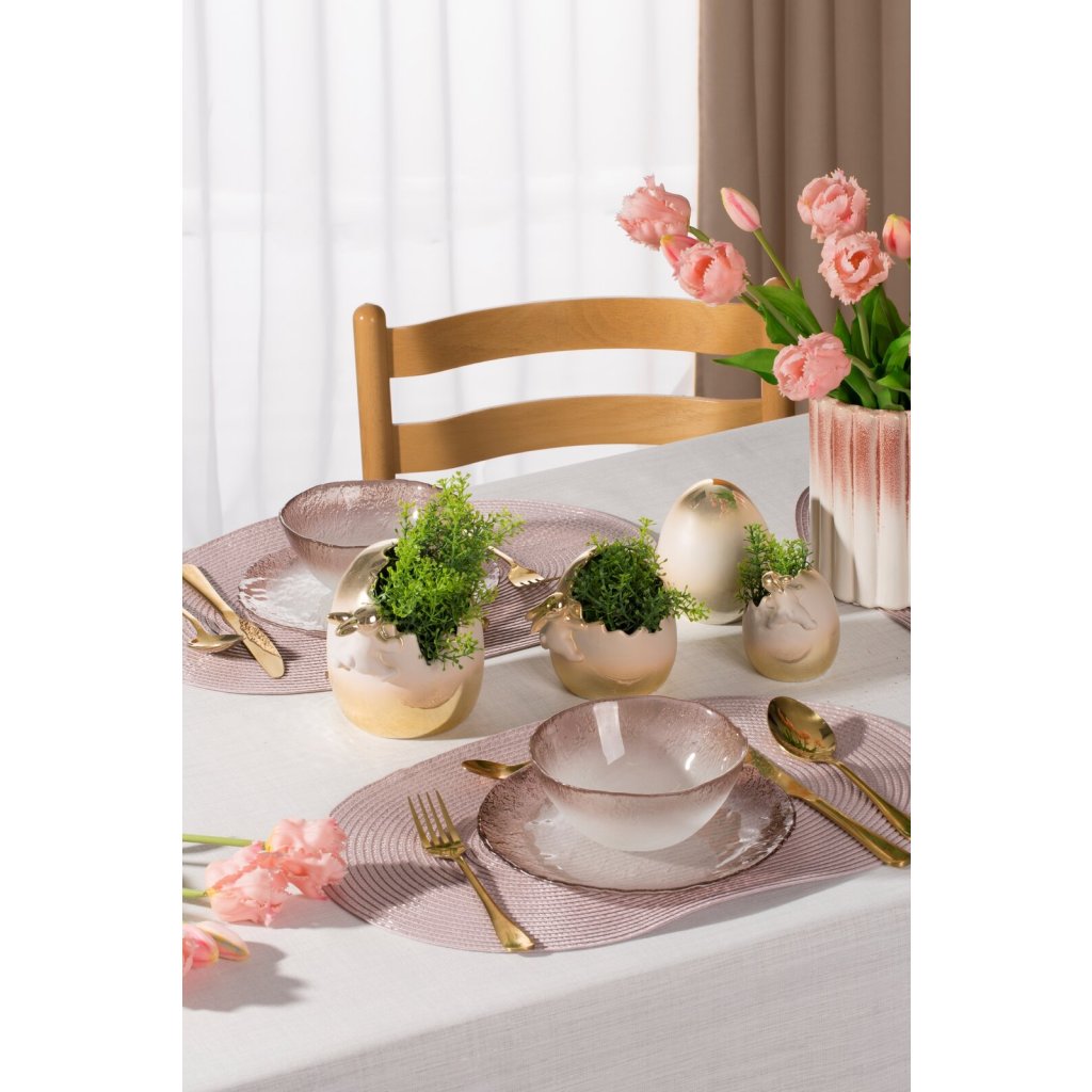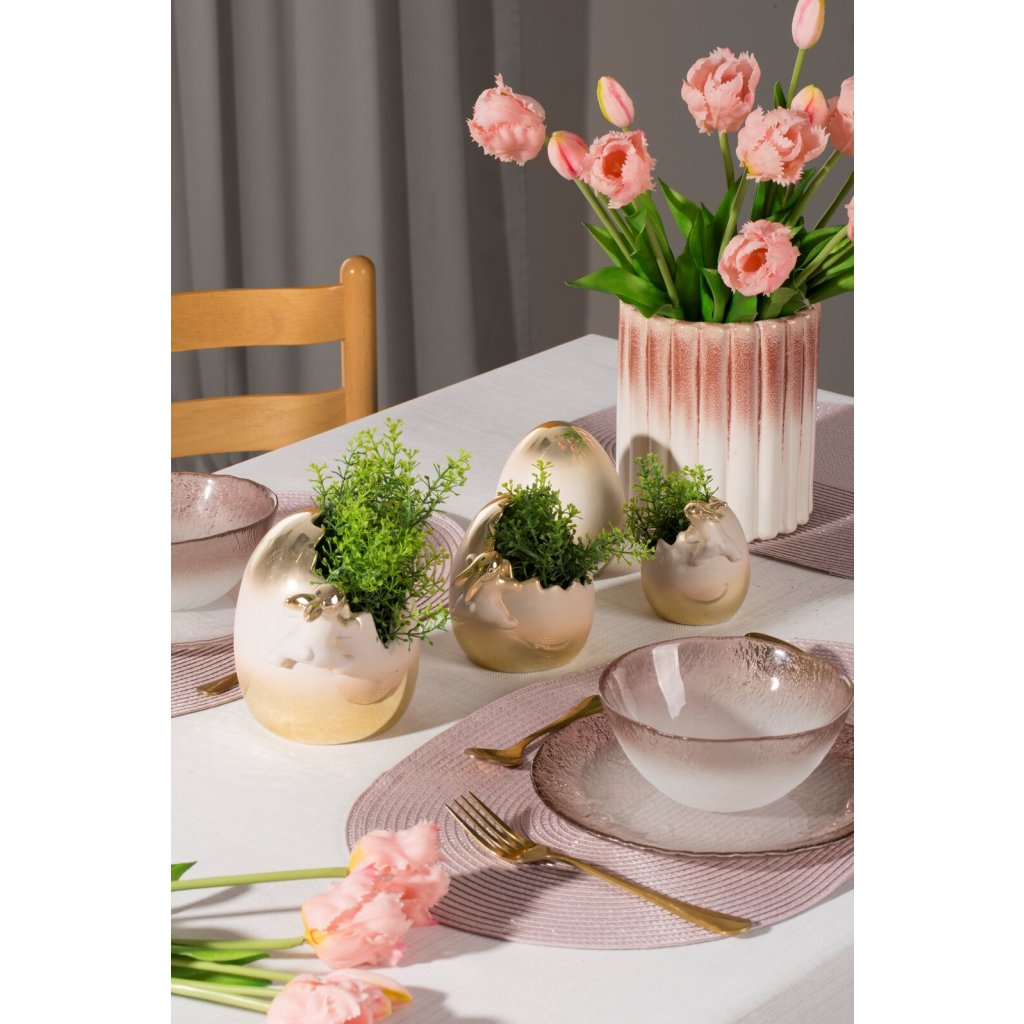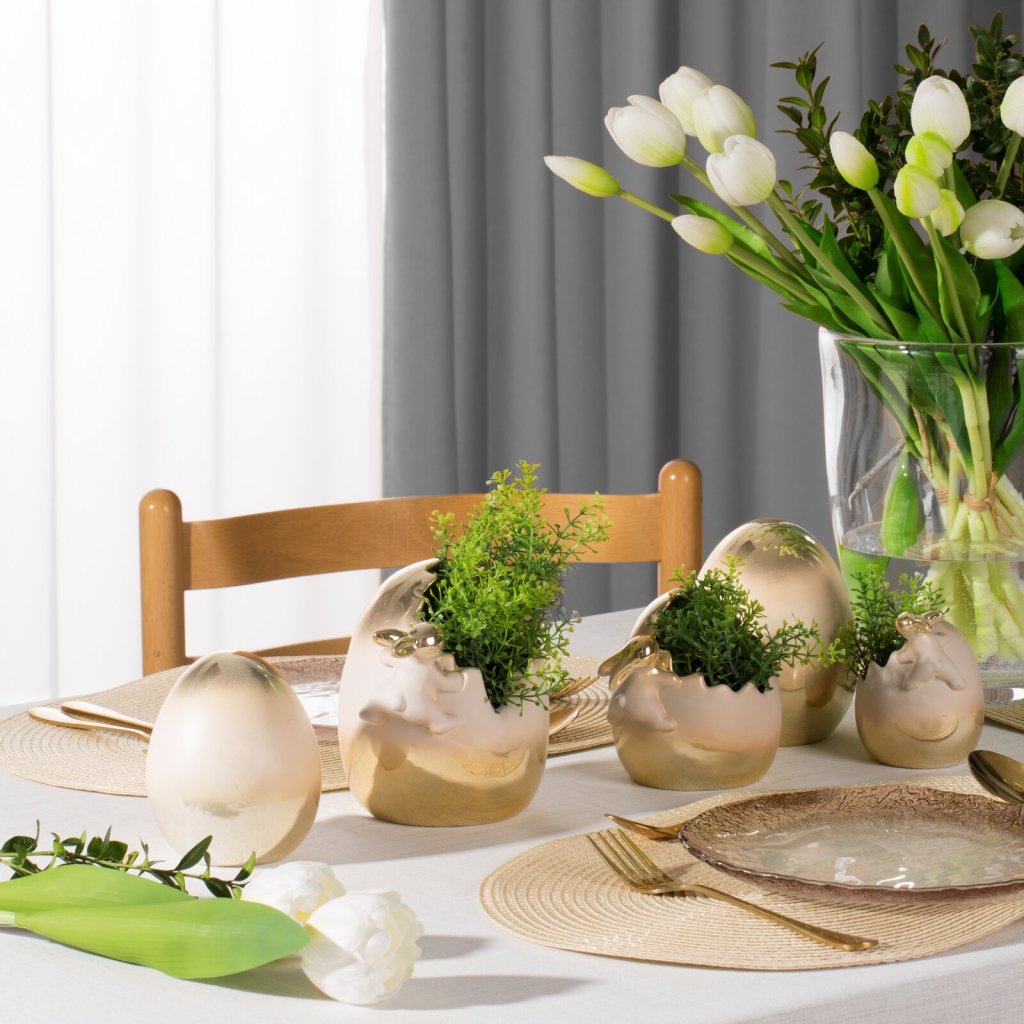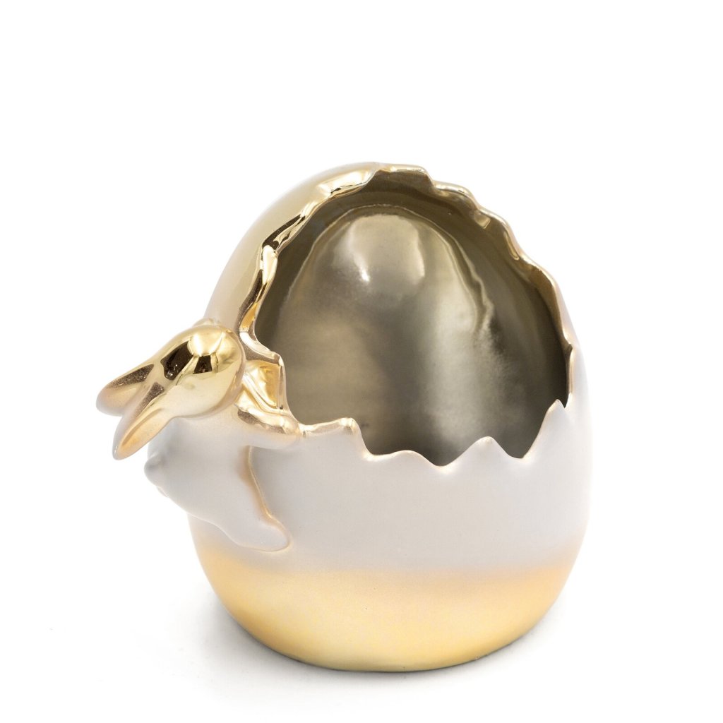 Stylová a elegantní velikonoční figurka z kvalitní keramické hlíny. Její jedinečný design podtrhuje výrazný dekor ombré, který jí dodává moderní a luxusní charakter. Díky preciznímu zpracování a harmonickým barevným přechodům soška upoutá pozornost a stane se poutavou dekorací. Ideální pro milovníky neobvyklých dekorací, které spojují tradici s moderním designem. Šířka: 12 cm, délka: 11 cm, barva: krémová a zlatá, složení: keramická hlína.Doplňkové parametry