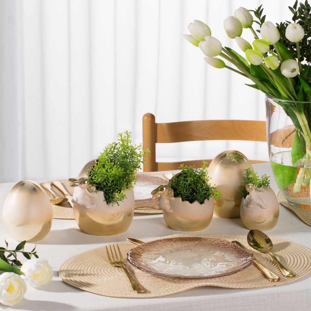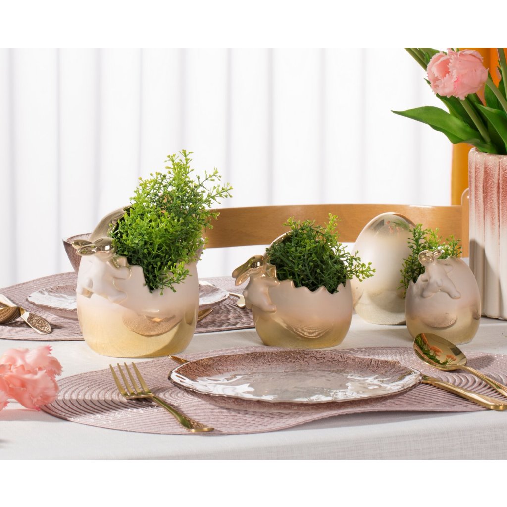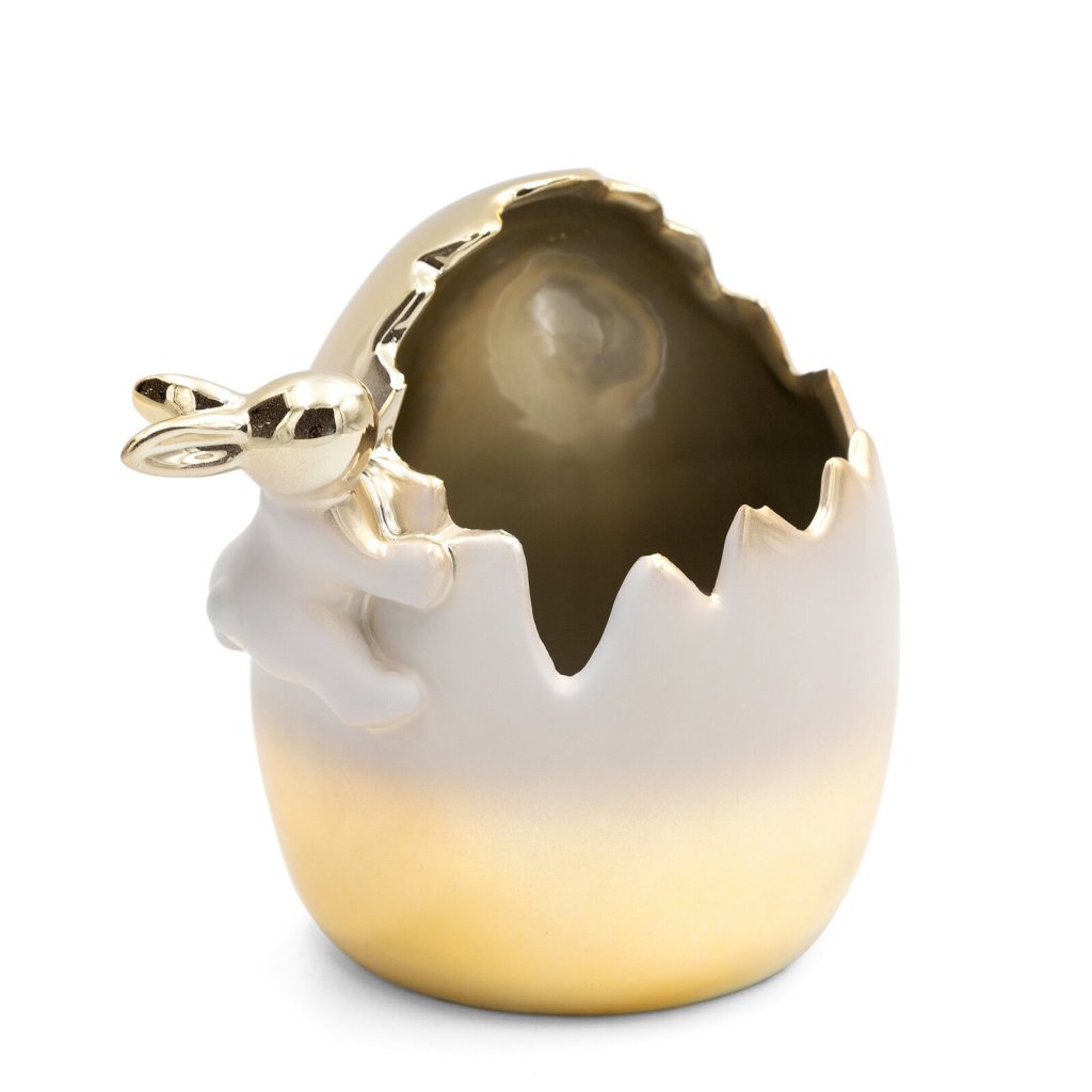 Stylová a elegantní velikonoční figurka z kvalitní keramické hlíny. Její jedinečný design podtrhuje výrazný dekor ombré, který jí dodává moderní a luxusní charakter. Díky preciznímu zpracování a harmonickým barevným přechodům soška upoutá pozornost a stane se poutavou dekorací. Ideální pro milovníky neobvyklých dekorací, které spojují tradici s moderním designem. Šířka: 15 cm, délka: 14 cm, barva: krémová a zlatá, složení: keramická hlína.Doplňkové parametry