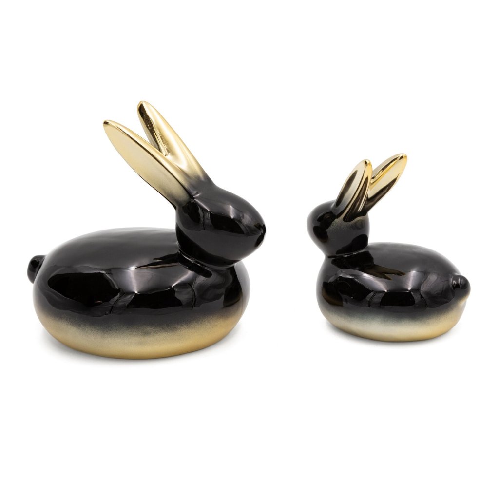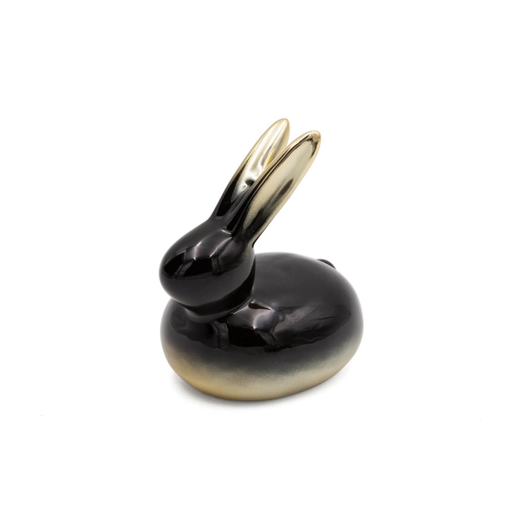 Stylová a elegantní velikonoční figurka ve tvaru zajíčka z kvalitní keramické hlíny. Její jedinečný design podtrhuje výrazný dekor ombré, který jí dodává moderní a luxusní charakter. Díky preciznímu zpracování a harmonickým barevným přechodům figurka upoutá pozornost a stane se poutavou dekorací. Ideální pro milovníky neobvyklých dekorací, které spojují tradici s moderním designem. Šířka: 10 cm, délka: 10 cm, barva: černá a zlatá, složení: keramická hlína.Doplňkové parametry