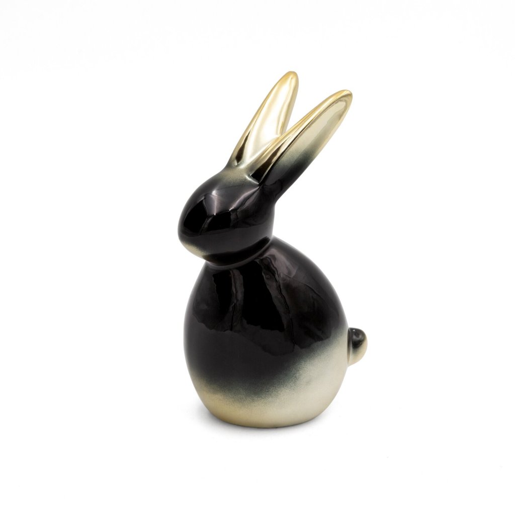 Stylová a elegantní velikonoční figurka ve tvaru zajíčka z kvalitní keramické hlíny. Její jedinečný design podtrhuje výrazný dekor ombré, který jí dodává moderní a luxusní charakter. Díky preciznímu zpracování a harmonickým barevným přechodům figurka upoutá pozornost a stane se poutavou dekorací. Ideální pro milovníky neobvyklých dekorací, které spojují tradici s moderním designem. Šířka: 10 cm, délka: 17 cm, barva: černá a zlatá, složení: keramická hlína.Doplňkové parametry