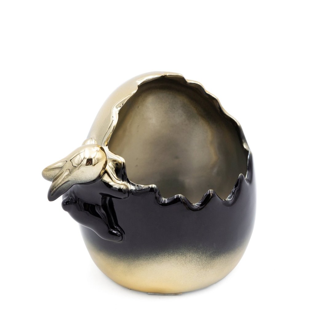 Stylová a elegantní velikonoční figurka ve tvaru zajíčka z kvalitní keramické hlíny. Její jedinečný design podtrhuje výrazný dekor ombré, který jí dodává moderní a luxusní charakter. Díky preciznímu zpracování a harmonickým barevným přechodům figurka upoutá pozornost a stane se poutavou dekorací. Ideální pro milovníky neobvyklých dekorací, které spojují tradici s moderním designem. Šířka: 12 cm, délka: 11 cm, barva: černá a zlatá, složení: keramická hlína.Doplňkové parametry