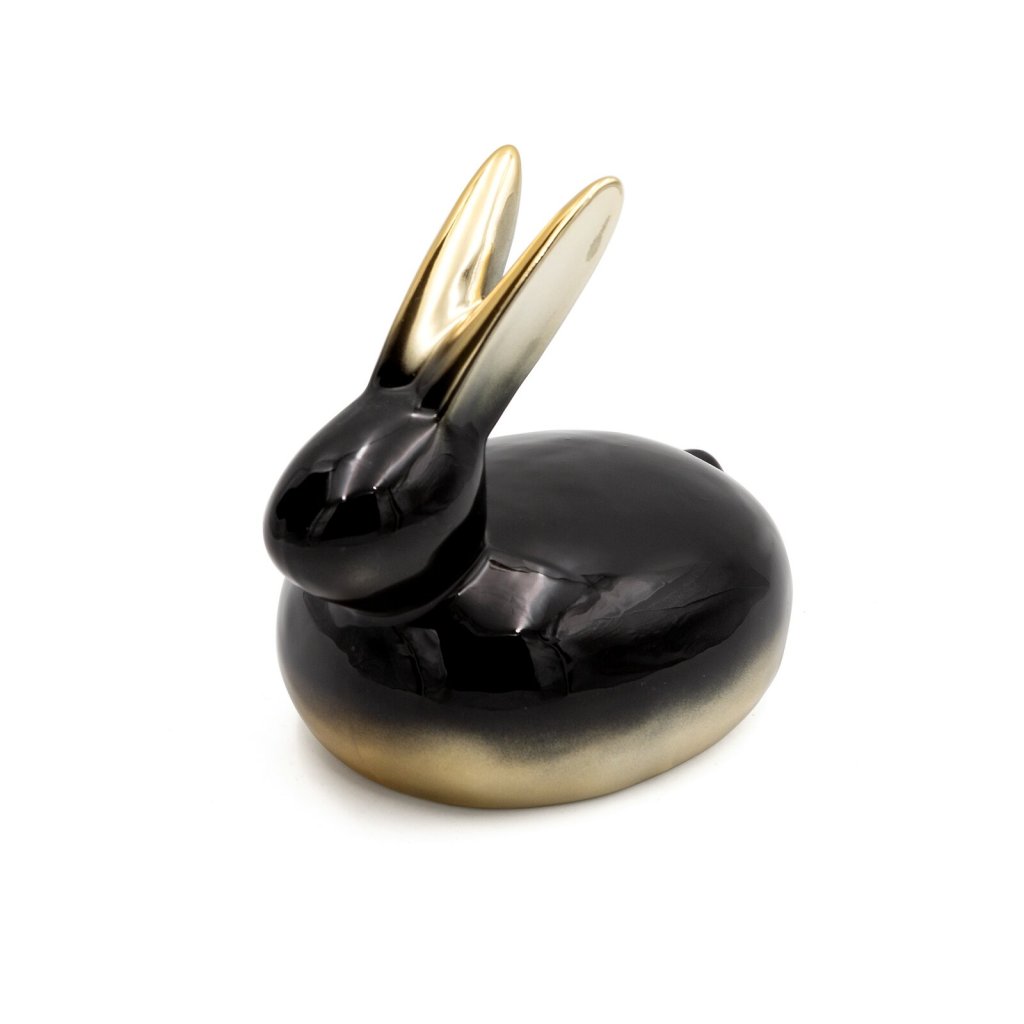 Stylová a elegantní velikonoční figurka ve tvaru zajíčka z kvalitní keramické hlíny. Její jedinečný design podtrhuje výrazný dekor ombré, který jí dodává moderní a luxusní charakter. Díky preciznímu zpracování a harmonickým barevným přechodům figurka upoutá pozornost a stane se poutavou dekorací. Ideální pro milovníky neobvyklých dekorací, které spojují tradici s moderním designem. Šířka: 14 cm, délka: 13 cm, barva: černá a zlatá, složení: keramická hlína.Doplňkové parametry