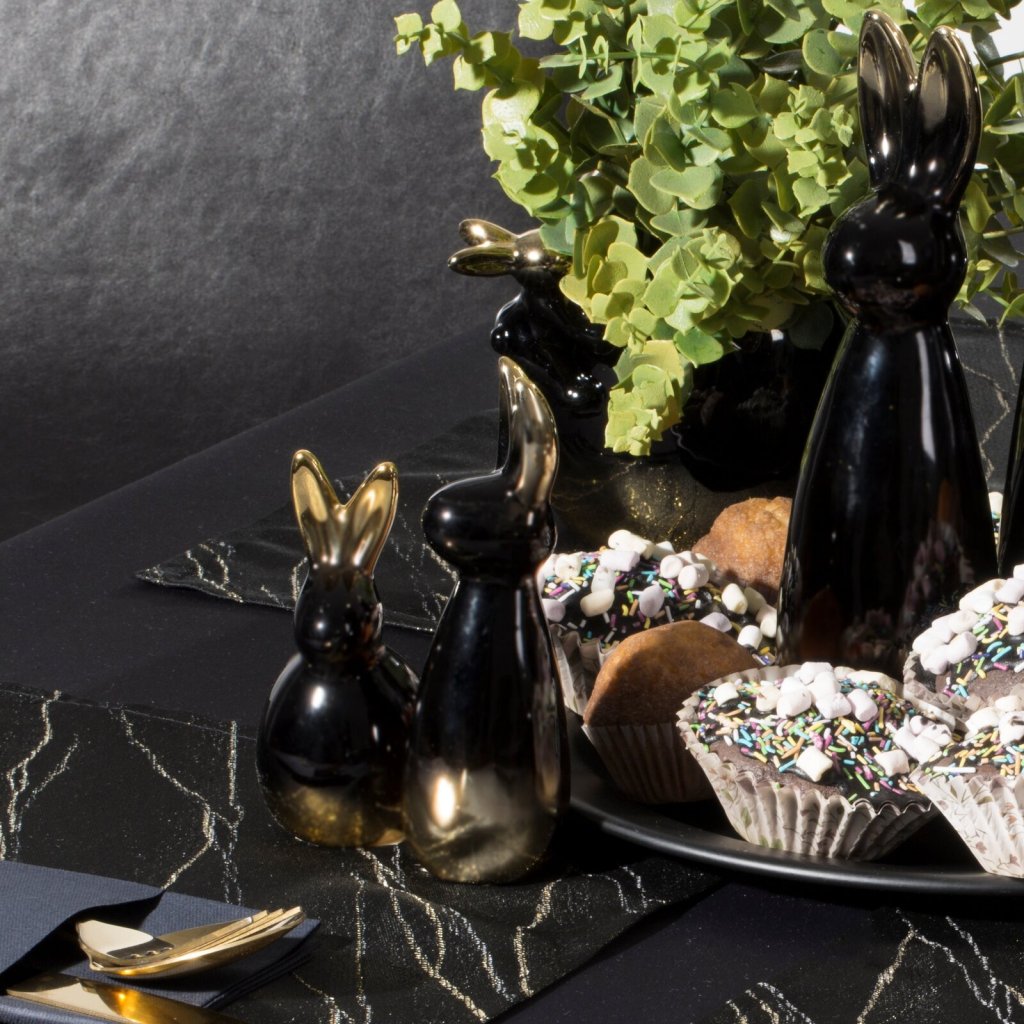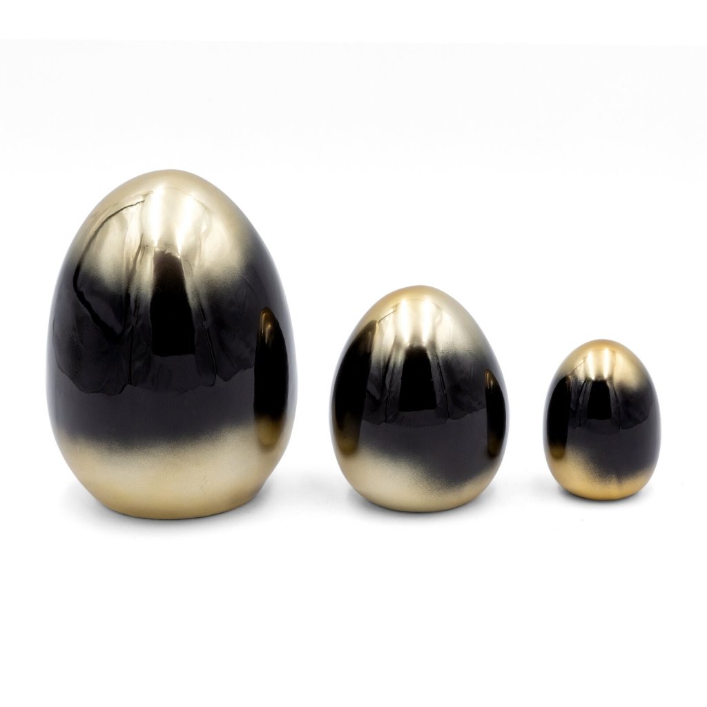 Stylová a elegantní velikonoční figurka ve tvaru zajíčka z kvalitní keramické hlíny. Její jedinečný design podtrhuje výrazný dekor ombré, který jí dodává moderní a luxusní charakter. Díky preciznímu zpracování a harmonickým barevným přechodům figurka upoutá pozornost a stane se poutavou dekorací. Ideální pro milovníky neobvyklých dekorací, které spojují tradici s moderním designem. Šířka: 6 cm, délka: 8 cm, barva: černá a zlatá, složení: keramická hlína.Doplňkové parametry