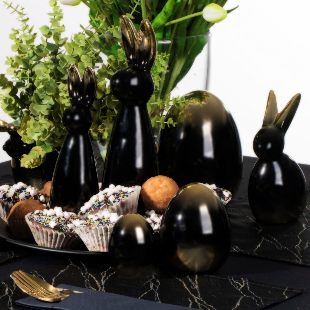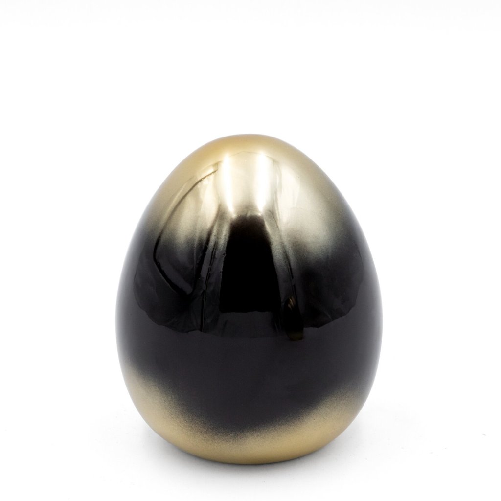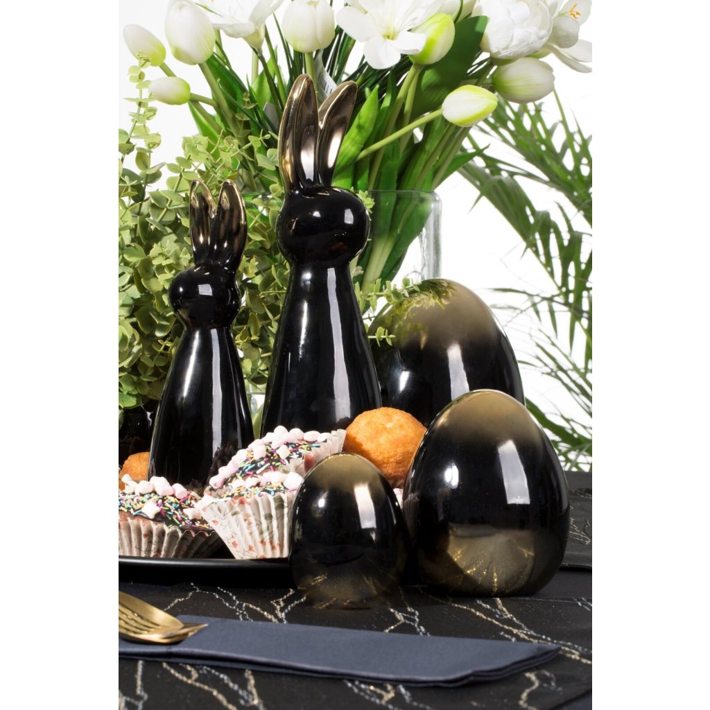 Stylová a elegantní velikonoční figurka ve tvaru zajíčka z kvalitní keramické hlíny. Její jedinečný design podtrhuje výrazný dekor ombré, který jí dodává moderní a luxusní charakter. Díky preciznímu zpracování a harmonickým barevným přechodům figurka upoutá pozornost a stane se poutavou dekorací. Ideální pro milovníky neobvyklých dekorací, které spojují tradici s moderním designem. Šířka: 9 cm, délka: 11 cm, barva: černá a zlatá, složení: keramická hlína.Doplňkové parametry