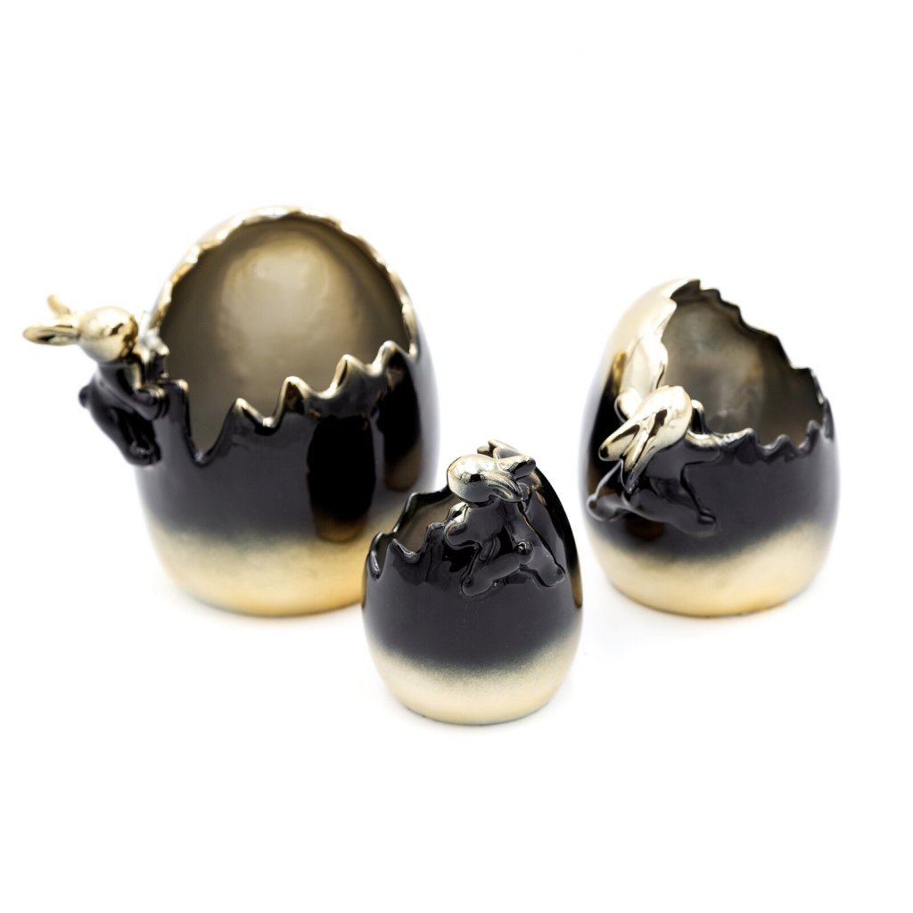 Stylová a elegantní velikonoční figurka ve tvaru zajíčka z kvalitní keramické hlíny. Její jedinečný design podtrhuje výrazný dekor ombré, který jí dodává moderní a luxusní charakter. Díky preciznímu zpracování a harmonickým barevným přechodům figurka upoutá pozornost a stane se poutavou dekorací. Ideální pro milovníky neobvyklých dekorací, které spojují tradici s moderním designem. Šířka: 9 cm, délka: 9 cm, barva: černá a zlatá, složení: keramická hlína.Doplňkové parametry